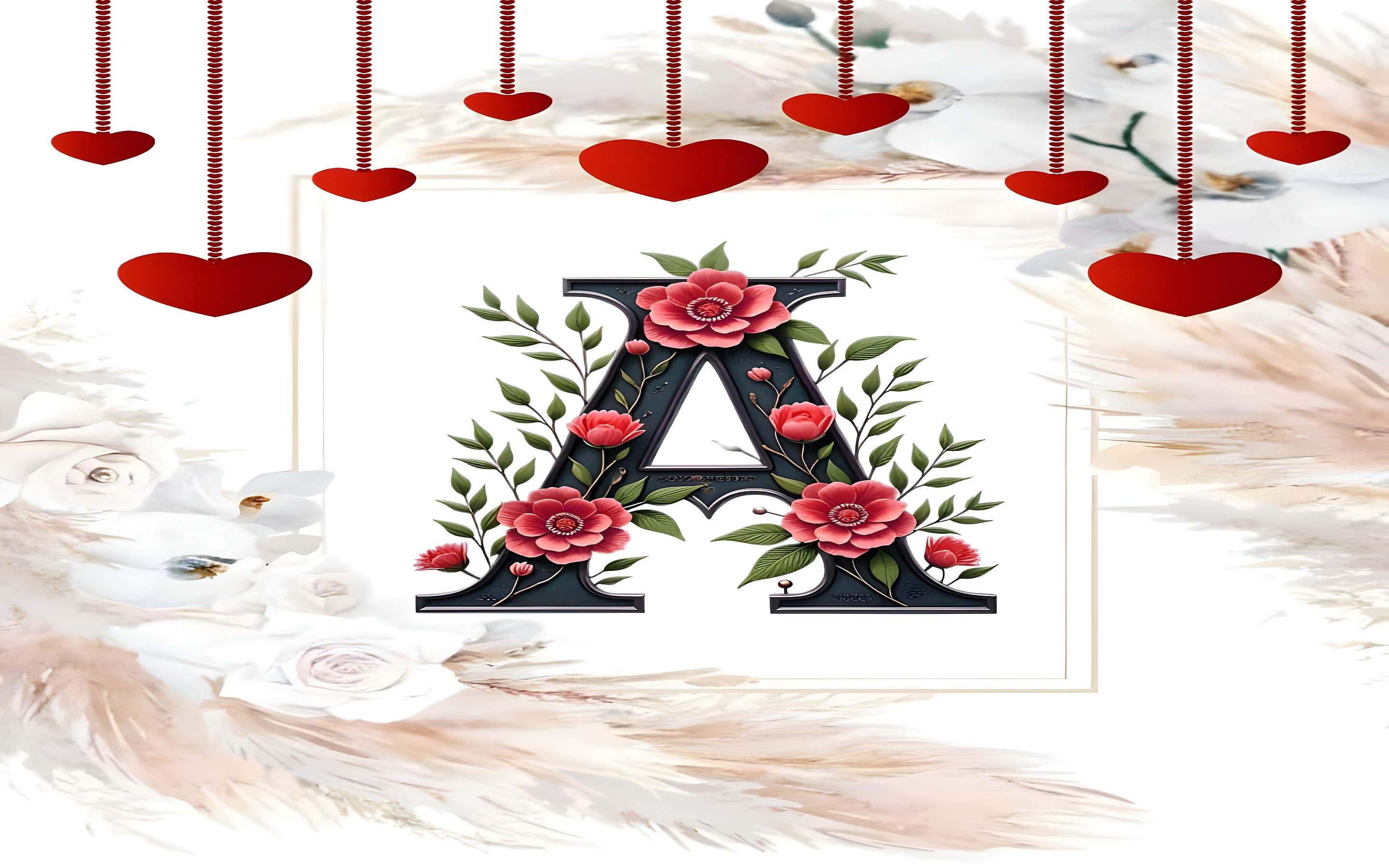 This exquisite Floral Letter A Romantic Wallpaper showcases a beautifully crafted letter 'A' adorned with lush red flowers and delicate green leaves, creating a captivating botanical theme. The letter itself is designed in a sophisticated serif style with a dark, almost black base that contrasts strikingly with the vibrant reds of the flowers and the rich greens of the foliage. Surrounding the letter is a soft, dreamy background of white and warm beige tones, featuring subtle floral and feather-like textures that add depth and a gentle, romantic atmosphere to the composition. Above the letter, a series of hanging red hearts on beaded strings add a charming and affectionate touch, enhancing the wallpaper's romantic vibe.