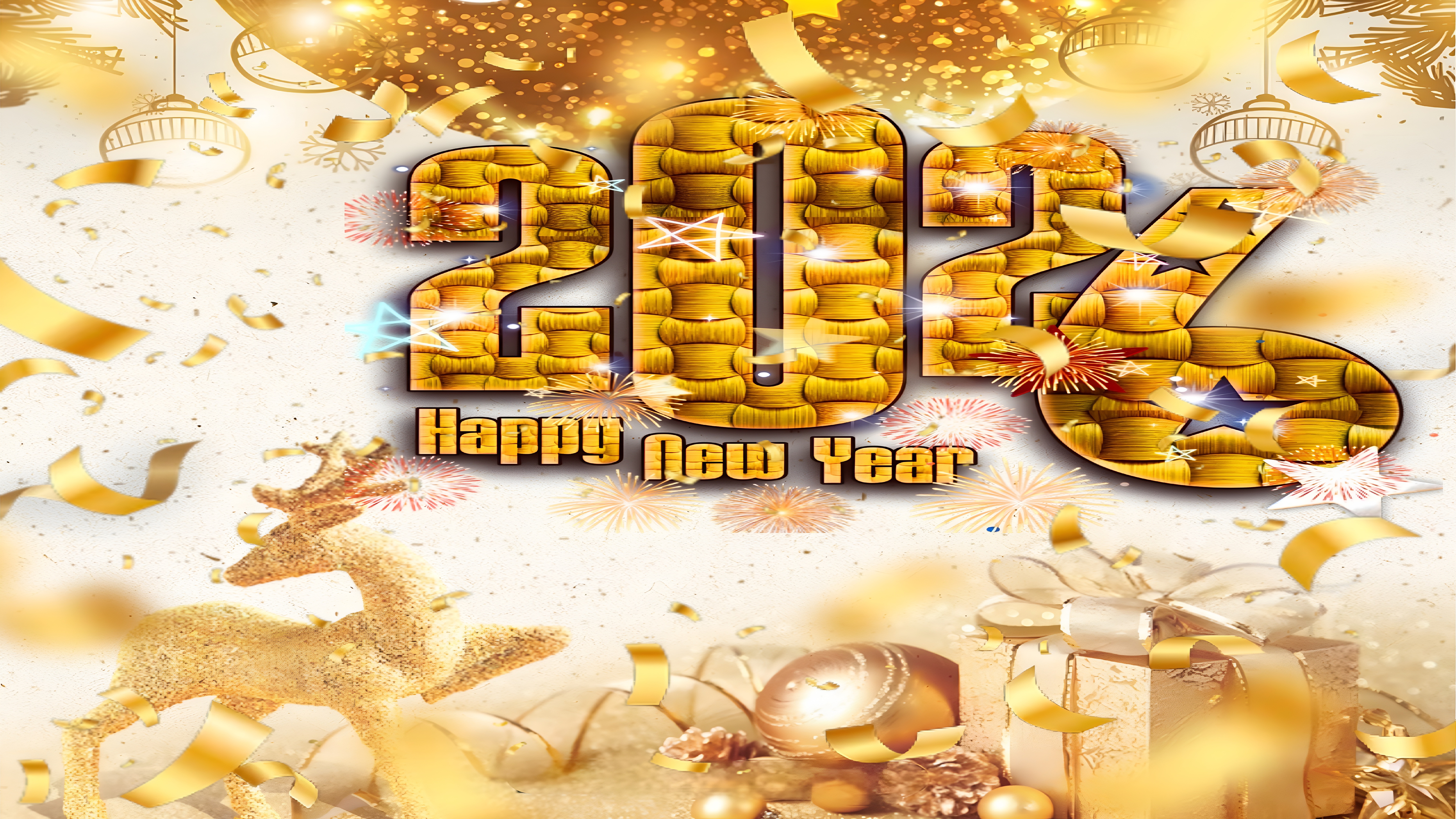 Celebrate the arrival of 2026 with this dazzling HD wallpaper featuring golden “2026” numerals surrounded by festive sparkles, fireworks, and shimmering confetti. The elegant “Happy New Year” message beneath the year adds warmth and charm, while decorative elements like glittery reindeer, wrapped gifts, ornaments, and pine cones enhance the celebratory mood. The radiant burst of golden light and hanging decorations at the top create a luxurious and joyful atmosphere, perfect for welcoming the new year with style. Ideal for users who love festive themes, this wallpaper brings a sense of excitement and hope to your screen.