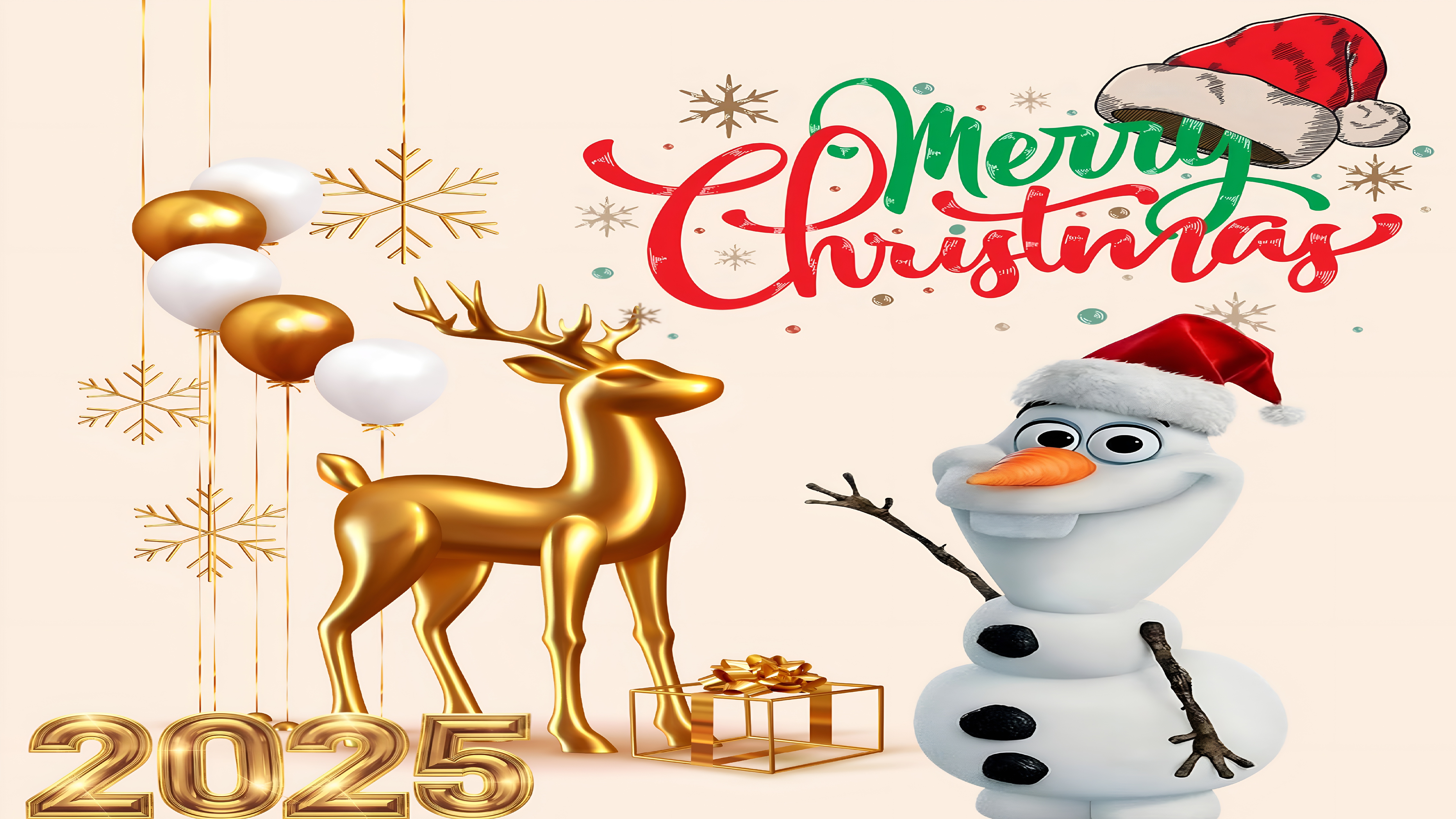 Celebrate the joy of Christmas 2025 with this vibrant HD wallpaper featuring a golden reindeer beside a transparent gift box wrapped in shimmering ribbon. Olaf, the beloved snowman from Disney’s Frozen, adds playful charm with his Santa hat and cheerful wave. The background sparkles with golden snowflakes, balloons, and colorful confetti, while the bold “Merry Christmas” greeting in red and green sets a merry tone. The golden “2025” at the bottom corner marks the celebration of a new festive year. Perfect for adding warmth, whimsy, and elegance to your screen during the holiday season.