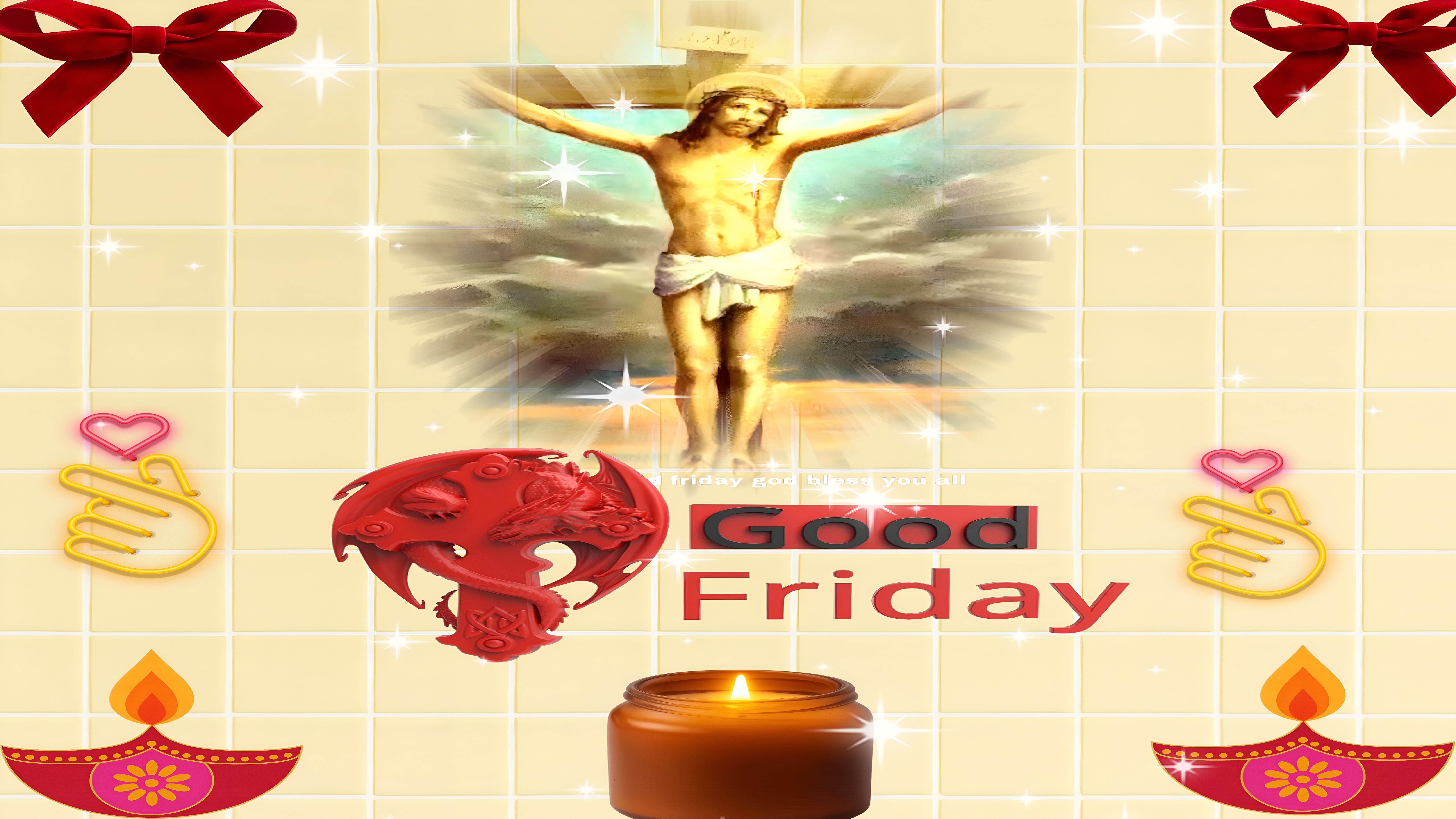 This Good Friday Spiritual HD Wallpaper masterfully combines warm beige tones with deep red accents and soft gold highlights to create a harmonious and uplifting visual experience. The lighting is carefully crafted to emphasize the central figure of Jesus on the cross, surrounded by a halo of light and subtle sparkles that enhance the sacred mood. The textures range from the smooth tiled background to the glowing candle and intricate dragon emblem, offering a rich sensory appeal. This blend of traditional Christian iconography with contemporary design elements makes it an ideal choice for those seeking a meaningful desktop background or mobile wallpaper that conveys spiritual depth and artistic elegance.