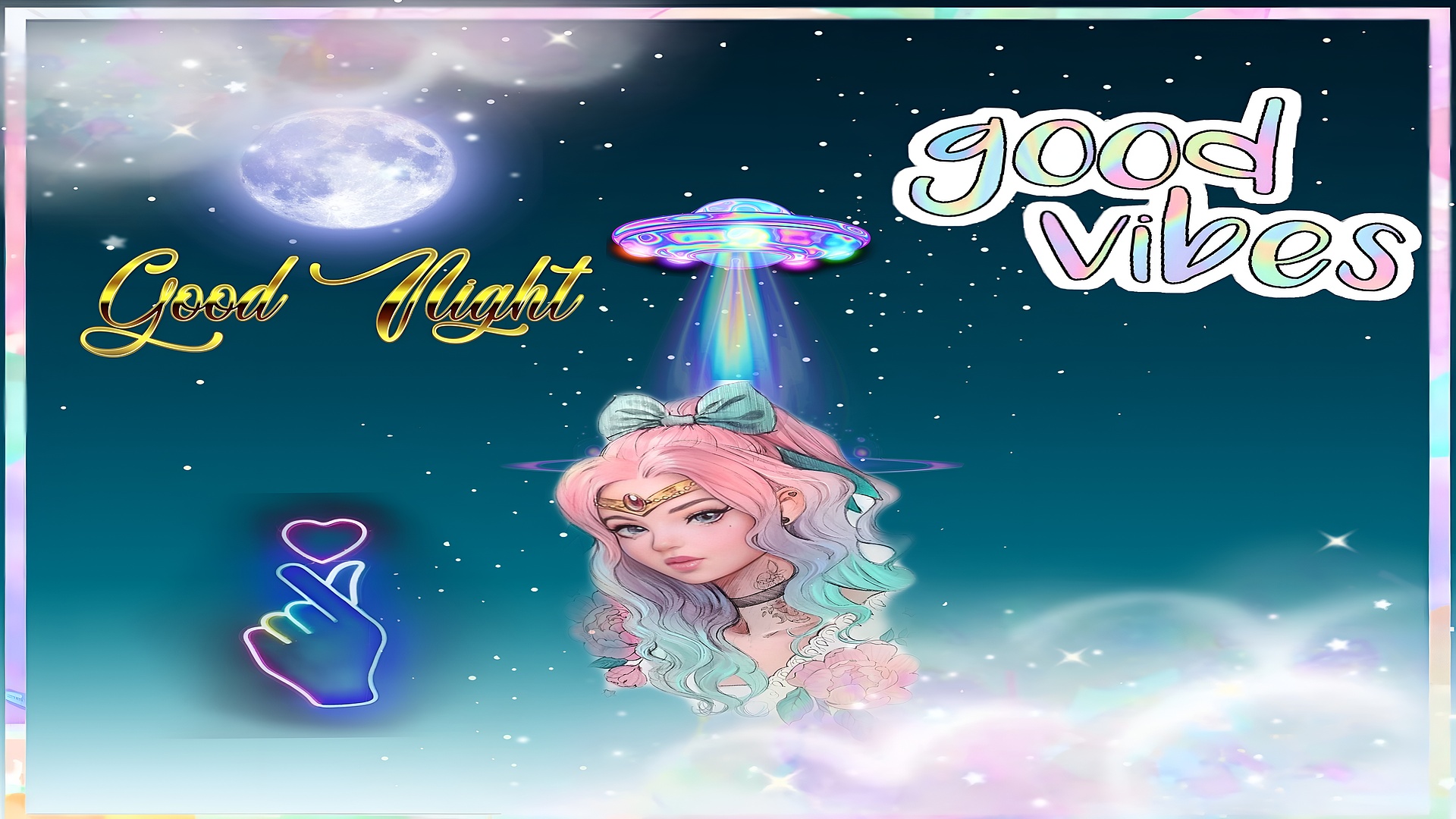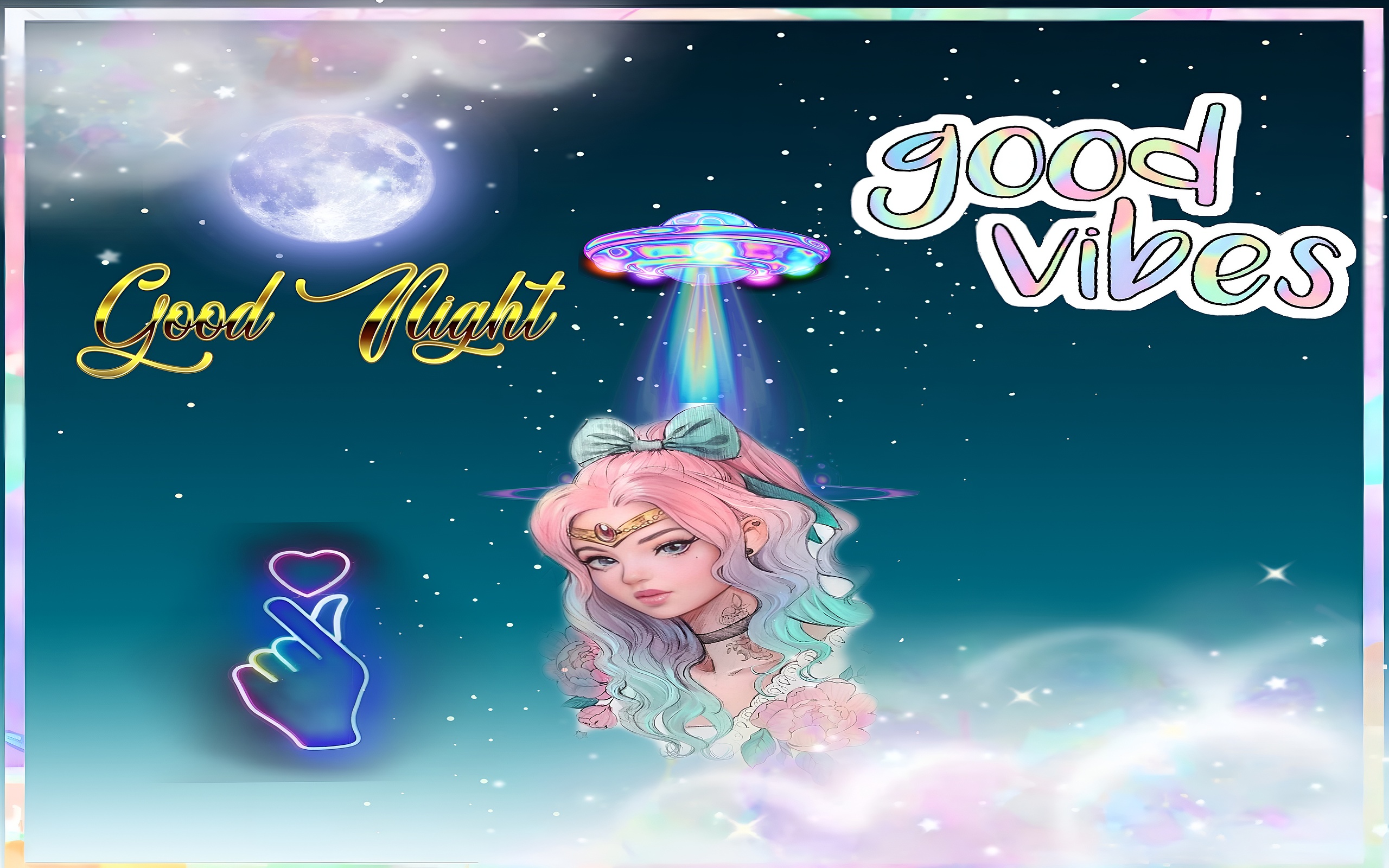 This Good Night Good Vibes Art wallpaper presents a captivating blend of dreamy fantasy and cosmic charm, perfect for anyone seeking a whimsical and soothing desktop or mobile background. The main subject is a beautifully illustrated young woman with pastel pink and aqua blue hair, styled with a large bow, surrounded by delicate floral accents. Above her, a vibrant, iridescent UFO emits a radiant beam of light, adding a surreal and magical touch to the night sky filled with twinkling stars and a glowing full moon. The artwork combines soft pastel hues with neon highlights, creating a visually enchanting atmosphere that evokes calmness and positivity.