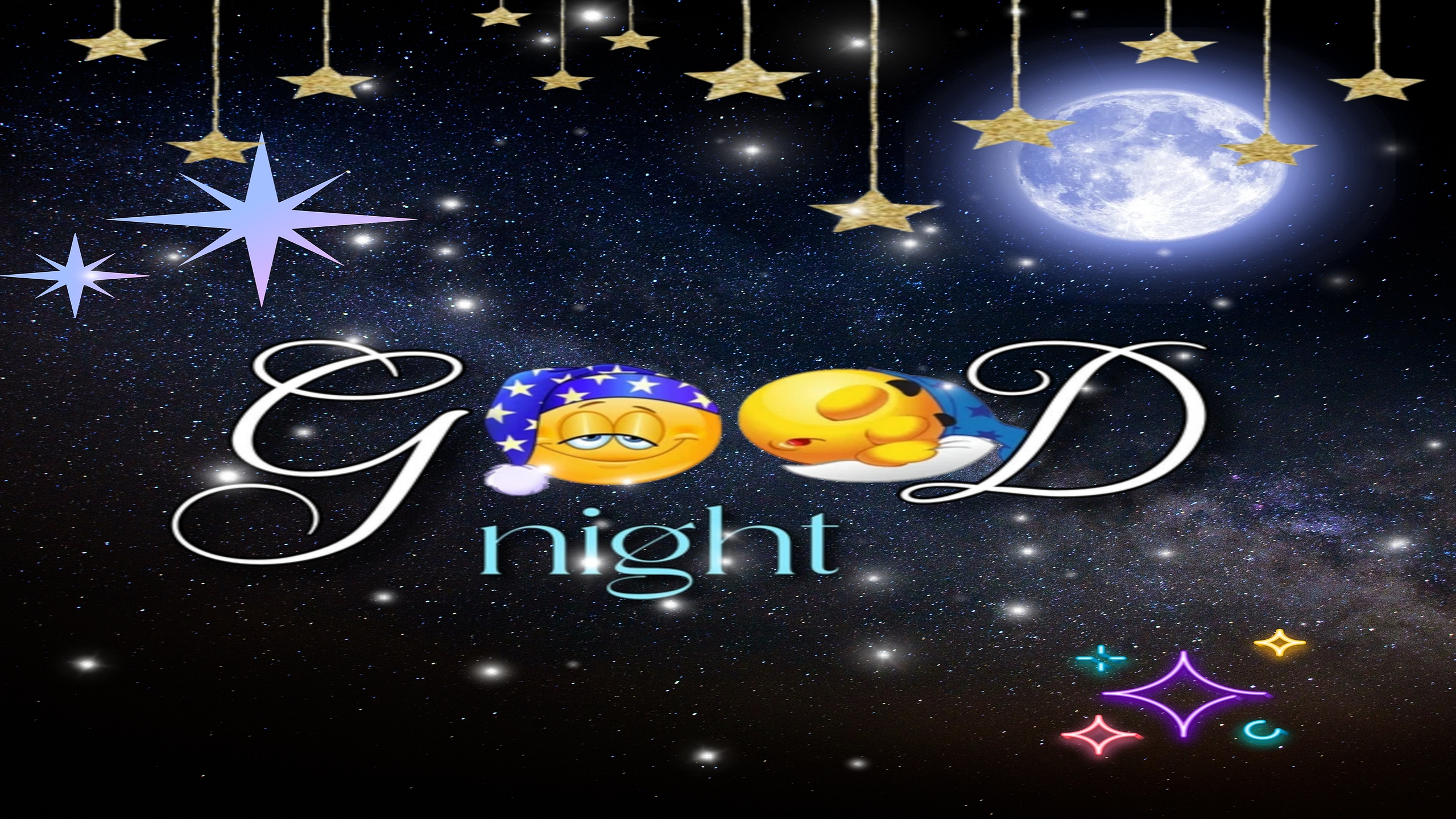 This Good Night Starry Sky Wallpaper captures a serene and enchanting nighttime scene perfect for anyone looking to add a calming and dreamy vibe to their digital devices. The main subject features a rich, deep navy blue starry sky filled with countless sparkling stars and a glowing full moon that radiates a soft white light. The text "Good night" is creatively integrated with two sleepy emoji faces wearing nightcaps, adding a playful and warm touch to the overall composition. Golden hanging stars dangle from the top, enhancing the celestial theme and creating a magical atmosphere.
