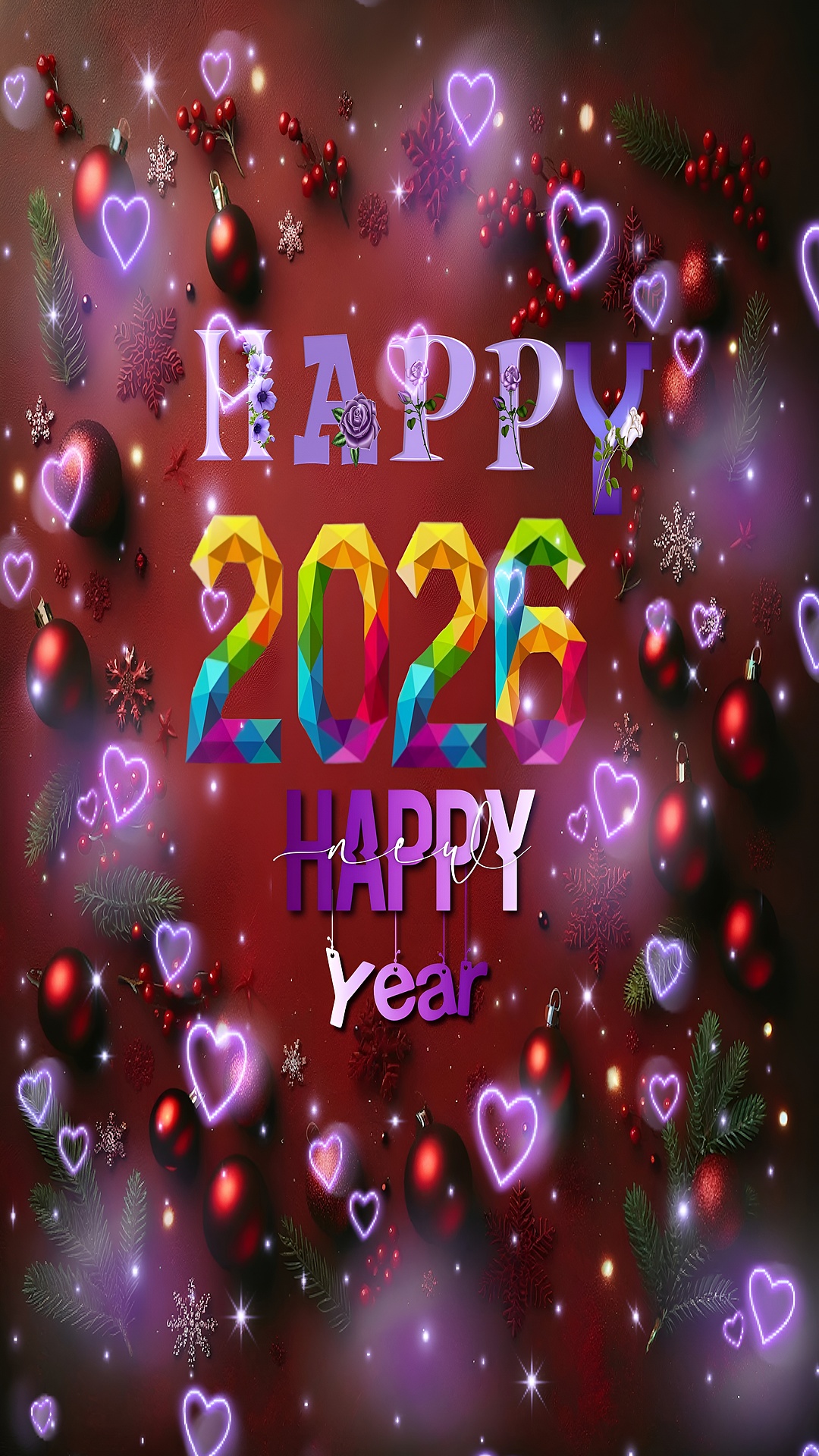 Happy 2026 new year this HD wallpaper captures the joyful spirit of the New Year 2026 with a rich red background adorned with glowing heart shapes, pine branches, red berries, snowflakes, and sparkling ornaments. The bold multicolored “2026” typography and floral-styled “HAPPY” headline add a dynamic and cheerful touch, while the playful “HAPPY new Year” text below completes the festive vibe. Perfect for adding warmth and celebration to your screen, this design blends traditional holiday motifs with modern flair. Ideal for users who love seasonal themes and want to start the year with positivity and color.