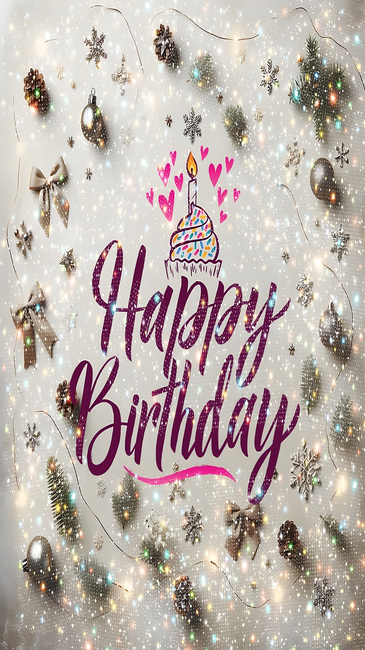 The background is adorned with delicate holiday-inspired decorations, including metallic silver baubles, pine cones, soft gold bows, and miniature evergreen sprigs. These elements are scattered artfully across a soft white surface, enhanced by twinkling fairy lights that create a magical, shimmering effect. This combination of colors and textures evokes a cozy, celebratory atmosphere perfect for winter birthdays or festive occasions.