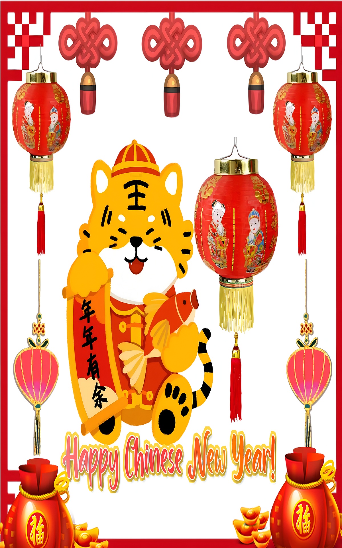 This Happy Chinese New Year Tiger Illustration captures the joyful spirit of the Lunar New Year with a charming cartoon tiger dressed in traditional attire. The tiger, symbolizing strength and good fortune, holds a bright orange fish, a classic emblem of abundance and prosperity in Chinese culture. Surrounding the tiger are iconic red lanterns adorned with golden tassels and intricate cultural motifs, enhancing the festive atmosphere. The artwork is framed with decorative red borders and traditional Chinese knots, creating a balanced and harmonious composition that celebrates heritage and joy.