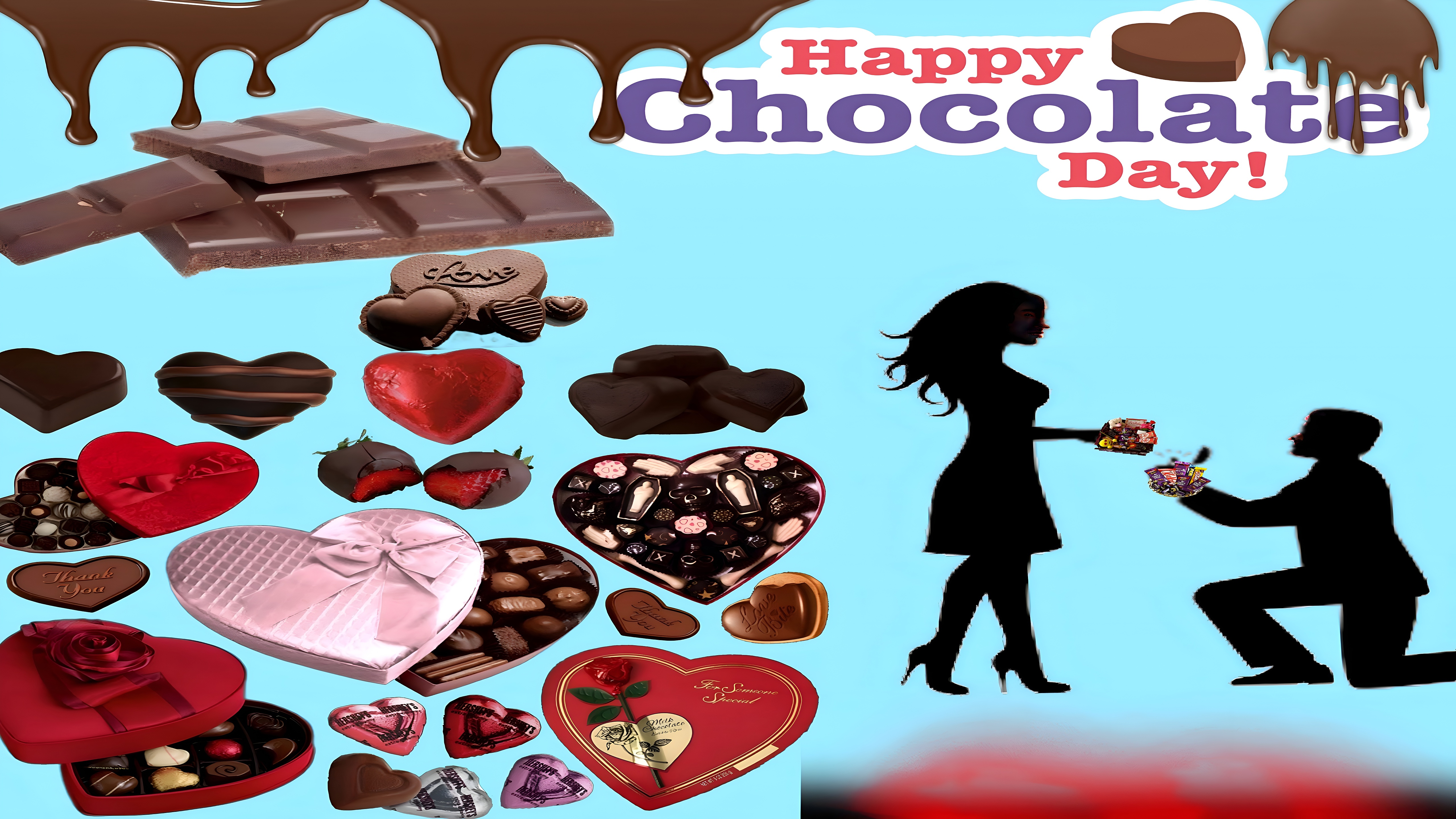 This Happy Chocolate Day Celebration Art wallpaper beautifully captures the essence of a romantic chocolate-themed occasion. The main subjects include an array of heart-shaped chocolates and chocolate gift boxes in rich, luscious browns and vibrant reds, set against a bright sky blue background. On the right side, a striking silhouette of a man kneeling and offering chocolates to a standing woman adds a tender, loving atmosphere to the composition. The dripping chocolate effect at the top adds a playful and indulgent touch, enhancing the overall theme of sweetness and affection.