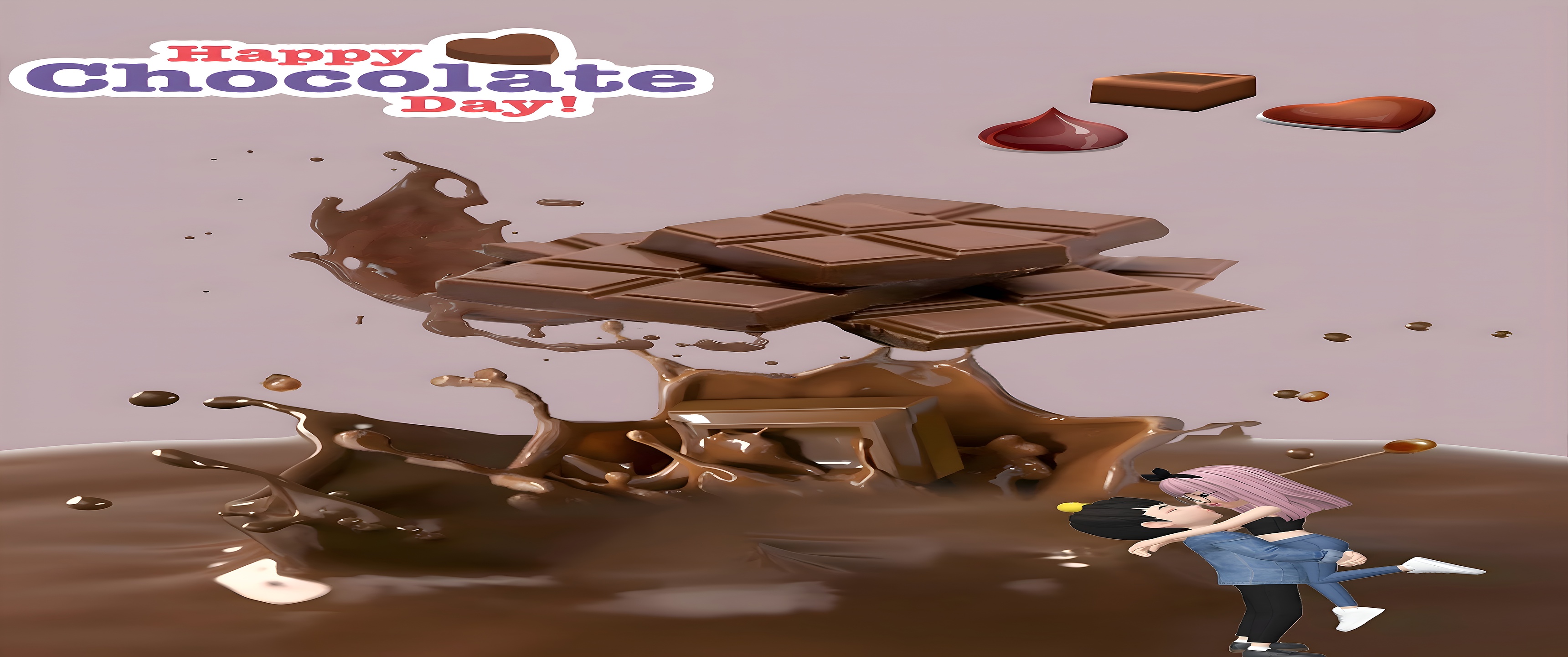 Celebrate the joy of love and chocolate with this delightful Happy Chocolate Day Romantic Splash HD wallpaper. Featuring a dynamic splash of rich milk chocolate bursting upward, this image captures the essence of indulgence and affection. At the center, several pieces of smooth, glossy chocolate bars hover mid-air, surrounded by droplets and splashes that create a lively, energetic atmosphere. The background is a soft mauve tone that perfectly complements the warm, inviting shades of brown, enhancing the overall cozy and romantic mood. Adding a charming touch, a cute 3D cartoon couple embraces joyfully in the lower right corner, symbolizing love and togetherness on this special day.
