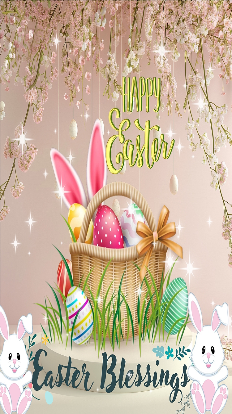 The Happy Easter Basket Celebration wallpaper features iconic Easter symbols such as decorated eggs with stripes, polka dots, and swirls in pastel hues, and two adorable white bunnies with pink ears and paws positioned at the bottom corners. These elements evoke feelings of renewal and happiness associated with Easter and spring. The hanging eggs and delicate floral branches overhead add depth and a festive ambiance, making this wallpaper a perfect choice for springtime celebrations. The soft lighting and gentle sparkles enhance the cheerful and peaceful mood, making it a favorite for those seeking seasonal desktop backgrounds or mobile wallpapers that capture the spirit of Easter.