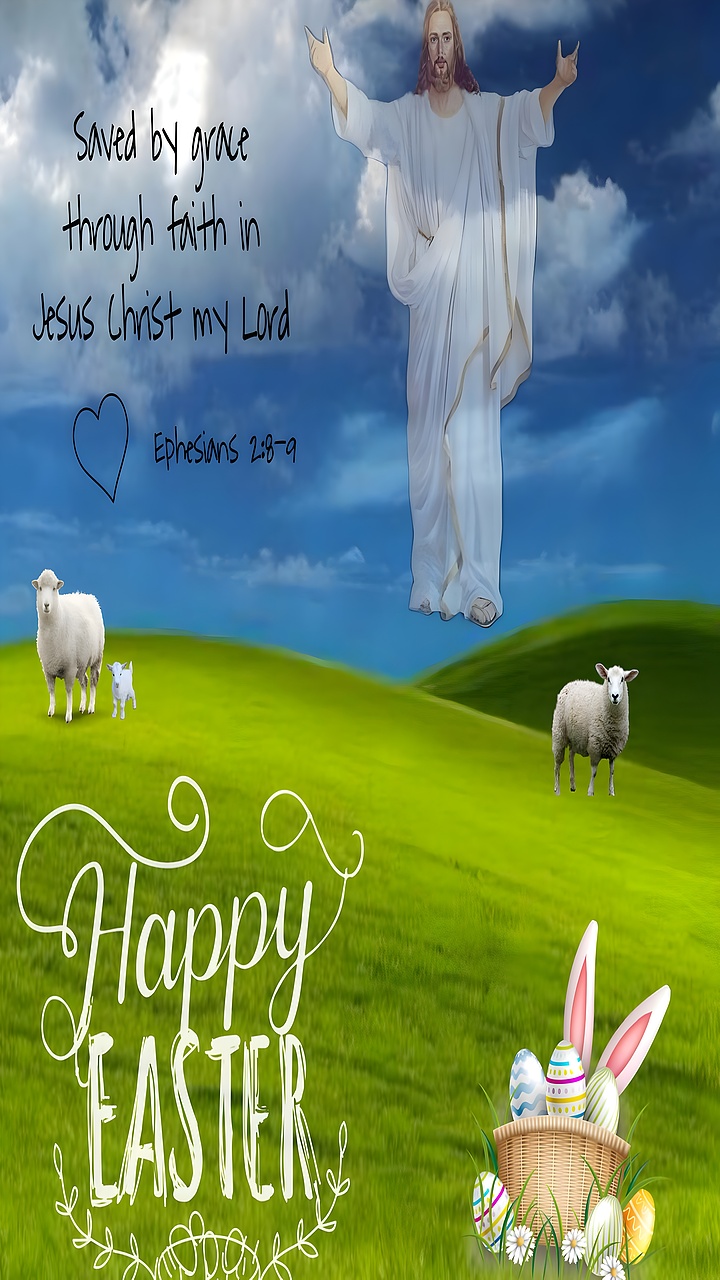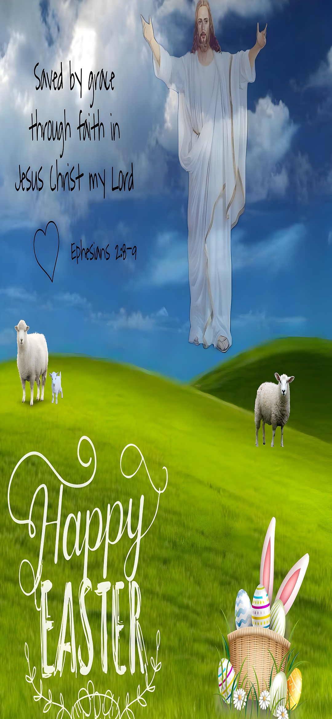 The wallpaper also features a charming Easter basket filled with colorful, intricately patterned eggs and adorned with bunny ears, blending traditional Easter motifs with the spiritual theme. The handwritten scripture from Ephesians 2:8-9, "Saved by grace through faith in Jesus Christ my Lord," adds a meaningful and inspirational touch, reinforcing the message of faith and salvation. This combination of elements makes the wallpaper perfect for those seeking a peaceful, faith-inspired desktop background or mobile wallpaper that celebrates the Easter season with warmth and grace.