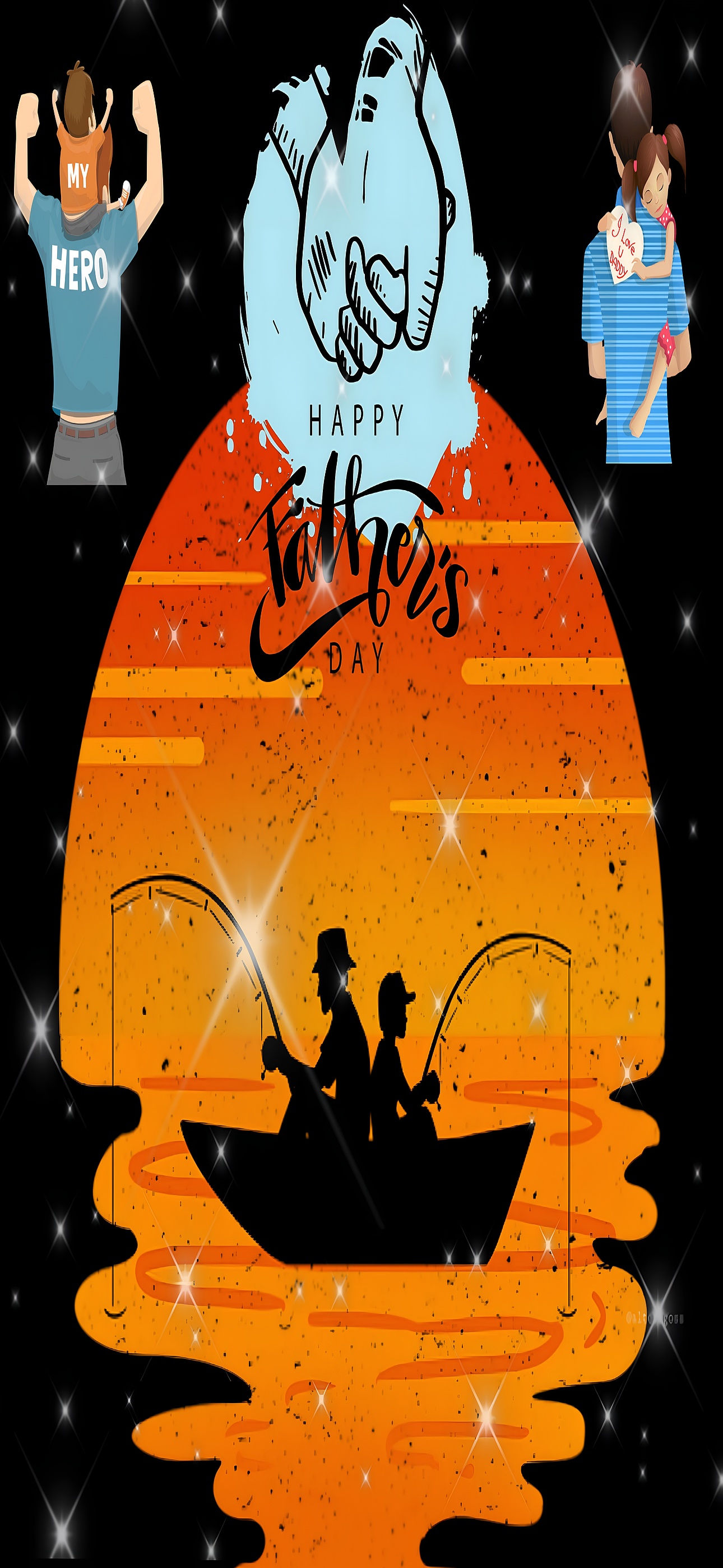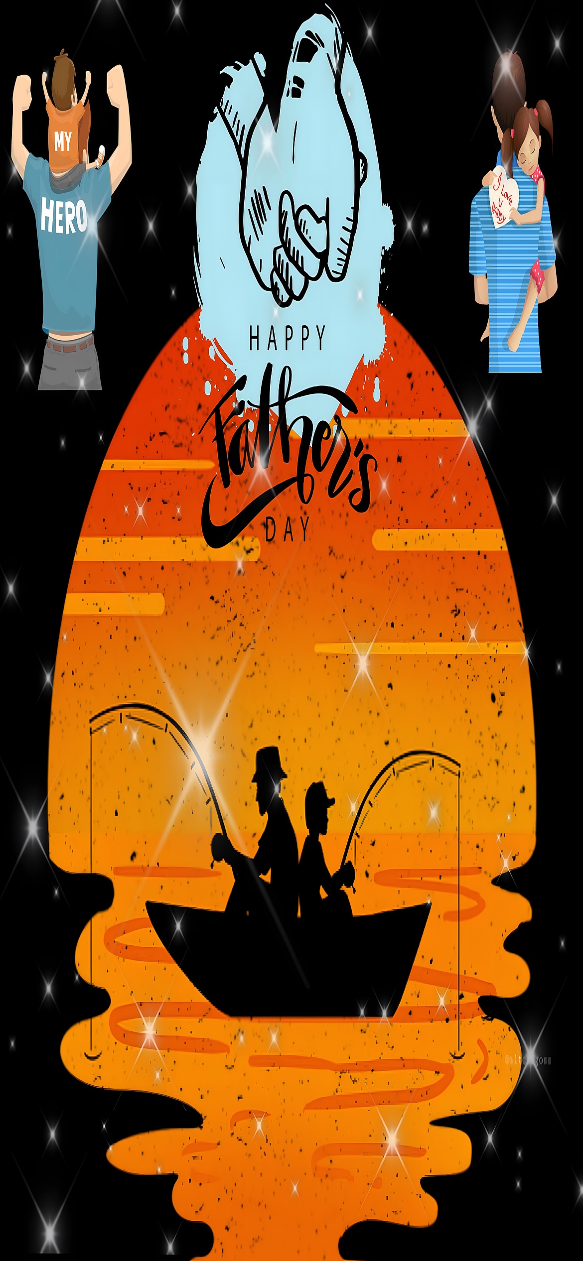 This Happy Father's Day Fishing Silhouette wallpaper is a perfect example of how family love and bonding can be visually expressed through simple yet powerful imagery. The father and son fishing scene is a classic symbol of quality time and shared experiences, often searched for in family-themed wallpapers and backgrounds. The use of warm orange hues alongside the soft blue accent creates a harmonious balance that appeals to those looking for heartwarming and sentimental desktop backgrounds. The sparkling effects add a festive touch, making this wallpaper suitable for seasonal celebrations and special occasions. Whether you want a mobile wallpaper that reflects father-child connection or a desktop background that inspires warmth and gratitude, this image fits seamlessly into those desires.