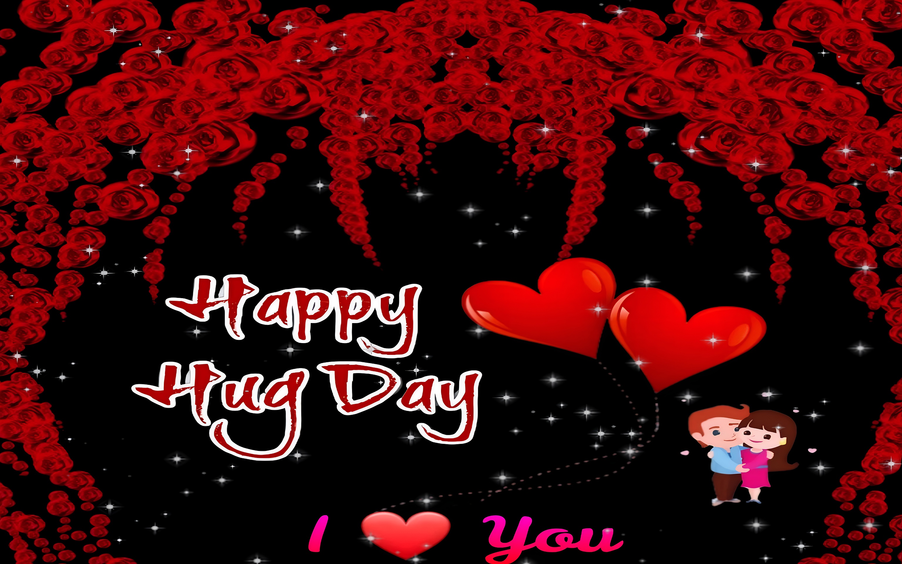 This Happy Hug Day Romantic Wallpaper captures the essence of affection and warmth with a visually striking design perfect for expressing love and togetherness. The main subject features a charming cartoon couple embracing tenderly, surrounded by two large, glossy red heart-shaped balloons that float gracefully against a deep black background. The upper part of the wallpaper is adorned with cascading red roses that create an elegant and romantic frame, while sparkling white stars scattered throughout add a magical, dreamy atmosphere. The vibrant red hues of the hearts and roses contrast beautifully with the black backdrop, making the colors pop and enhancing the overall emotional impact of the image.