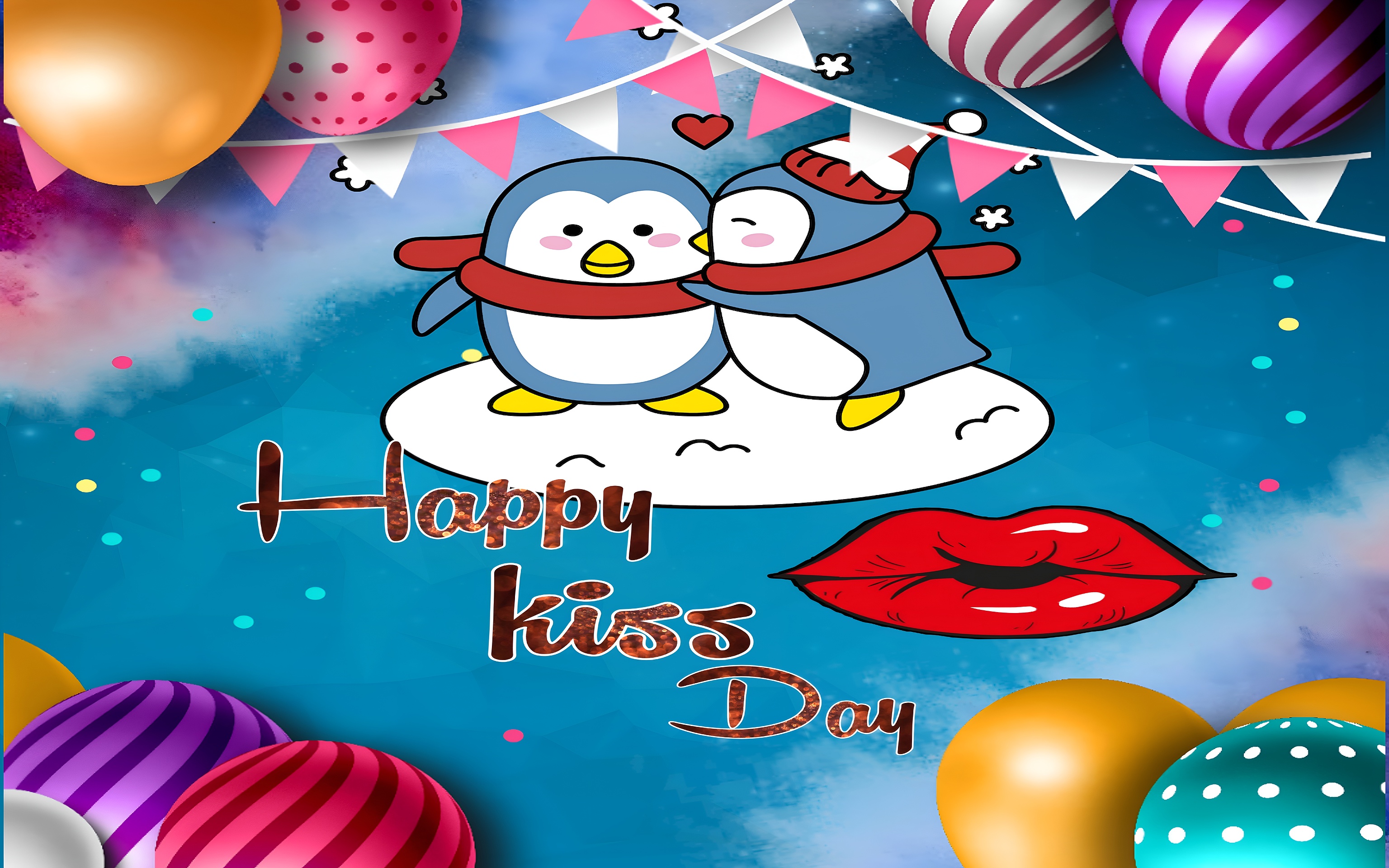The Happy Kiss Day Cute Penguins wallpaper stands out with its vivid color palette and joyful design elements. The bright blue background provides a calming yet energetic base, while the red accents in the lips and penguin scarves inject warmth and passion into the scene. Golden yellow balloons add a touch of festivity and brightness, complemented by pink highlights in the bunting flags and penguin blushes. This combination of colors makes the wallpaper visually appealing for those seeking romantic cartoon art with a festive twist. The playful penguin characters and decorative balloons create a lively atmosphere that suits themes like Valentine's Day, anniversaries, or any celebration of love and affection.
