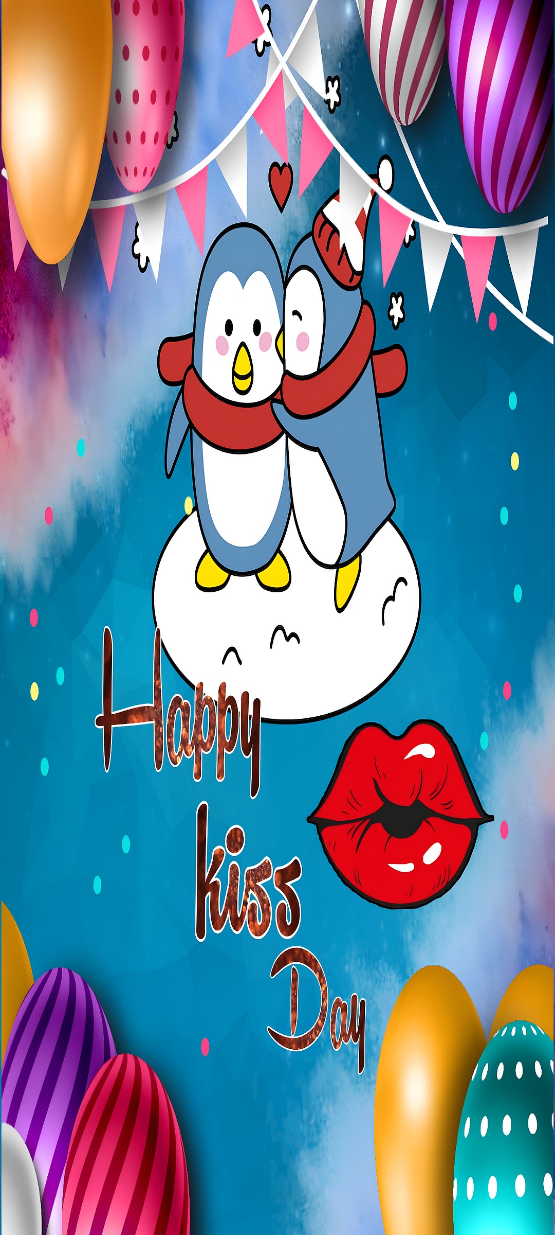 This delightful Happy Kiss Day Cute Penguins wallpaper captures a heartwarming moment between two adorable cartoon penguins sharing a loving embrace on a fluffy white cloud. The scene is set against a vibrant bright blue background, enriched with playful confetti dots in pastel shades, creating a festive and joyful atmosphere. Above the penguins, colorful party balloons in golden yellow, purple, red, and teal with white polka dots float alongside pink and white triangular bunting flags, enhancing the celebratory mood. The bold red lips graphic and the handwritten-style "Happy kiss Day" text add a romantic and whimsical touch, making this wallpaper perfect for expressing affection and joy.
