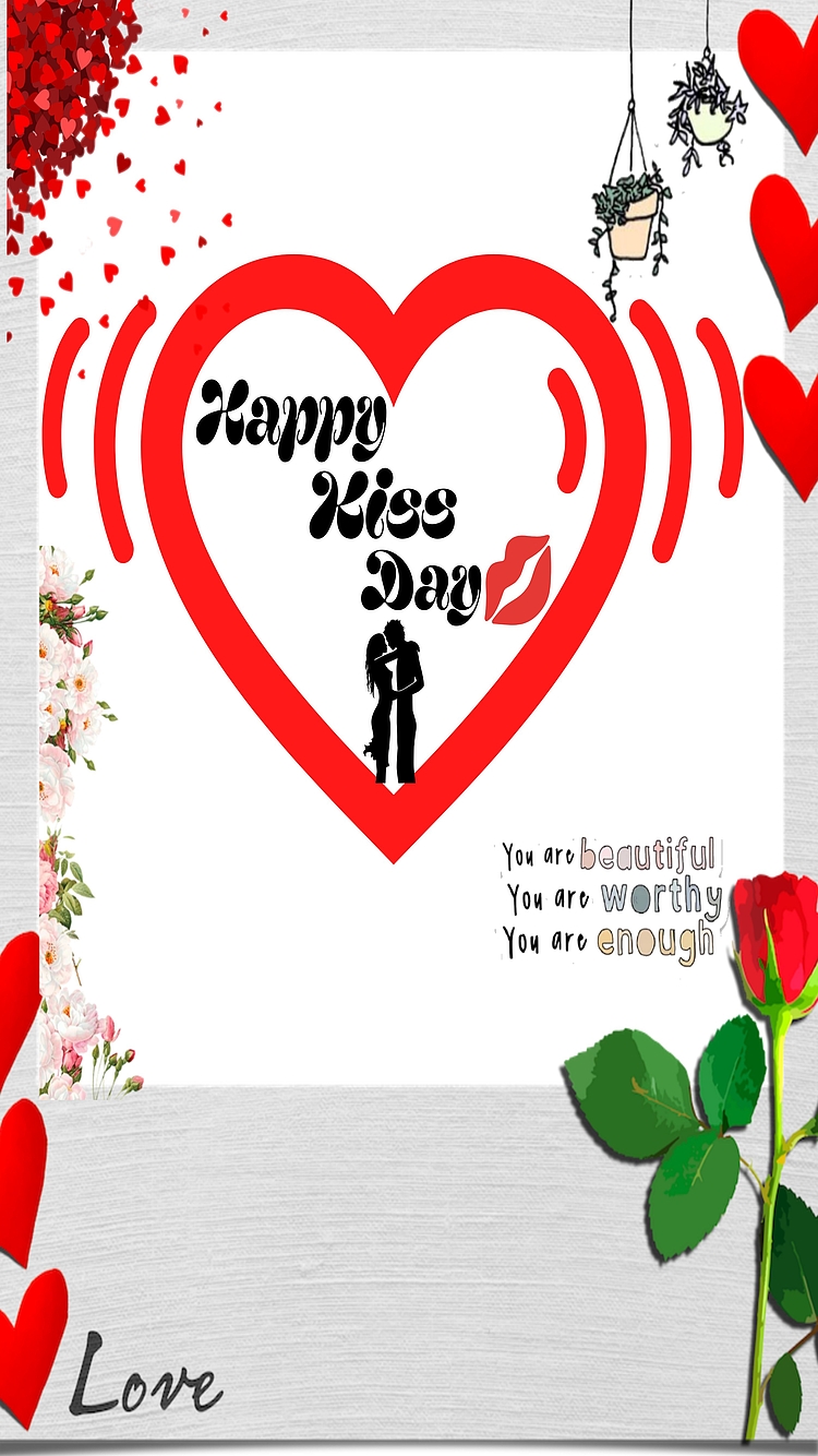 This Happy Kiss Day Romantic Heart Wallpaper beautifully captures the essence of love and intimacy with a striking red heart as its centerpiece. The heart encloses the playful, bold text "Happy Kiss Day" alongside a small silhouette of a couple sharing a tender moment, emphasizing romance and connection. The design is enhanced by a subtle red kiss mark, adding a charming touch that perfectly complements the affectionate theme. Surrounding the heart are delicate floral accents and hanging potted plants, which bring a natural softness and warmth to the composition. The wallpaper’s clean white background allows the vibrant reds and lush greens to pop, creating a visually appealing and emotionally uplifting image.