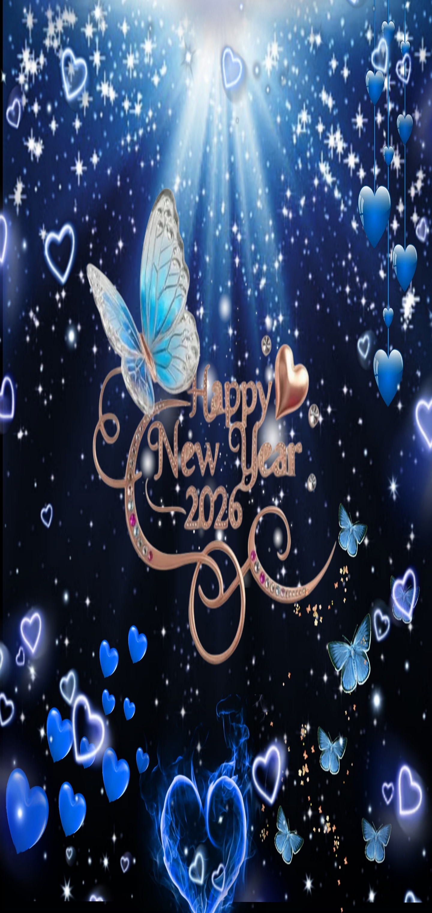 This Happy New Year 2026 Blue Butterfly Wallpaper features a harmonious blend of colors and light effects that evoke a sense of wonder and celebration. The vibrant blue butterfly symbolizes transformation and new beginnings, while the swirling silver script adds an elegant touch of sophistication. The sparkling heart shapes scattered throughout the image contribute to a warm, loving atmosphere, making this wallpaper a perfect choice for those seeking a festive yet serene desktop background. The glowing white highlights and soft silver tones enhance the depth and texture, creating a visually captivating scene that stands out on any device.