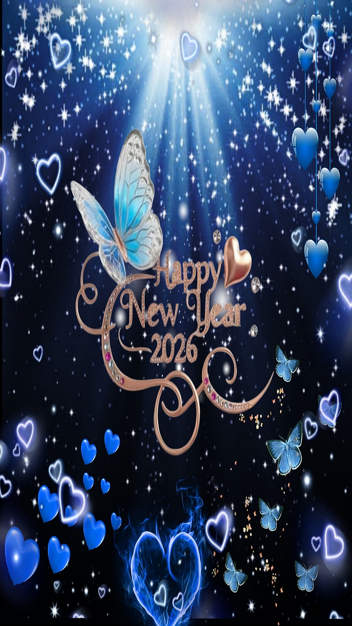 Celebrate the arrival of 2026 with this enchanting Happy New Year 2026 Blue Butterfly Wallpaper, a stunning piece of digital art designed to bring joy and sparkle to your screen. The central focus is a delicate blue butterfly perched gracefully above an elegant swirling script that reads “Happy New 2026,” surrounded by glowing heart shapes and shimmering particles. This wallpaper captures the essence of celebration with its vibrant blue hues and soft silver accents, creating a magical atmosphere perfect for welcoming the new year.