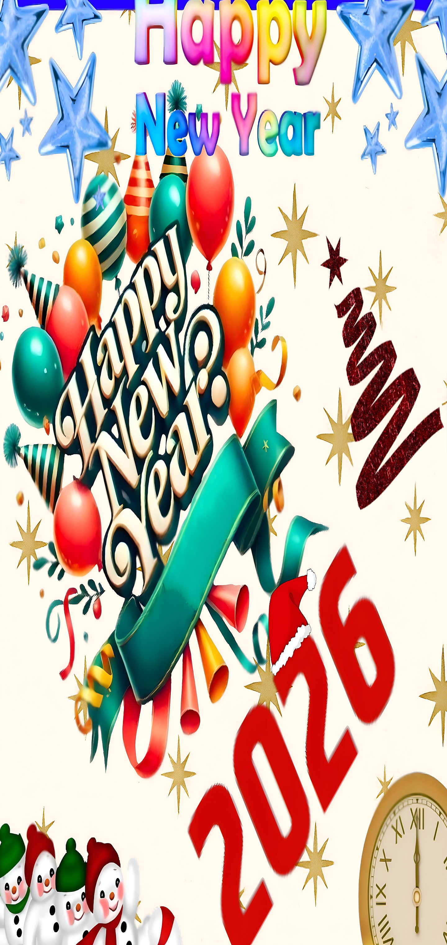 Happy new year 2026 Ring in the New Year with this vibrant HD wallpaper featuring the cheerful message “Happy New Year” and bold red “2026” numerals. The design bursts with celebratory elements—colorful balloons, sparkling confetti, party hats, and streamers—creating a lively atmosphere perfect for welcoming the year ahead. Snowmen add a wintery charm in the corner, while a classic clock hints at the midnight countdown. This wallpaper captures the excitement and warmth of New Year festivities, making it ideal for seasonal personalization. Whether you’re celebrating with friends or reflecting quietly, this joyful image sets the tone for a hopeful and happy beginning.