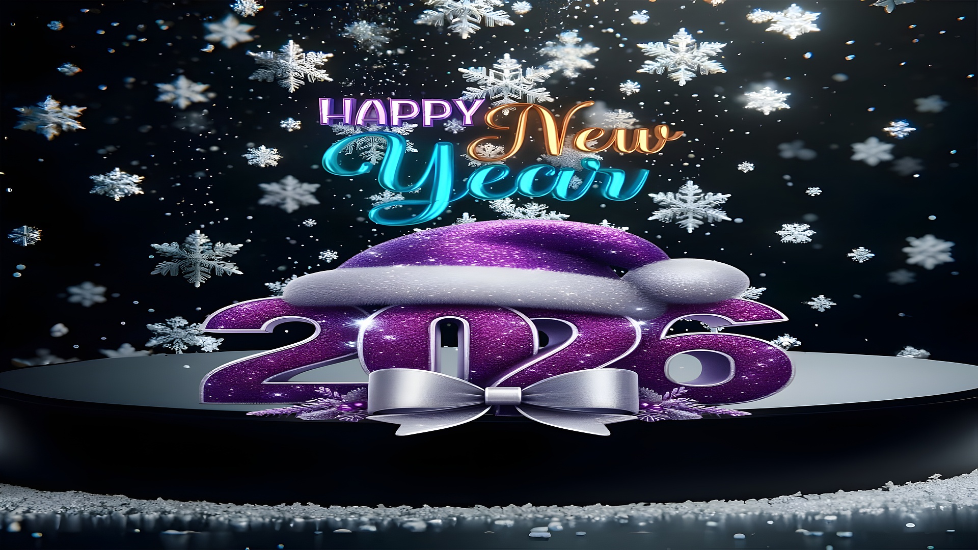 This Happy New Year 2026 Celebration Wallpaper captures the joyous spirit of the upcoming year with a dazzling and festive design. The main focus is the bold, glittering purple numbers "2026," adorned with a plush, snowy white Santa hat that adds a warm holiday touch. Above the numbers, the vibrant "Happy New Year" text shines in a mix of neon blue, coppery gold, and soft purple hues, creating a lively and inviting atmosphere. Surrounding the centerpiece, delicate snowflakes gently fall against a dark, almost black background, enhancing the winter theme with a magical, sparkling effect.