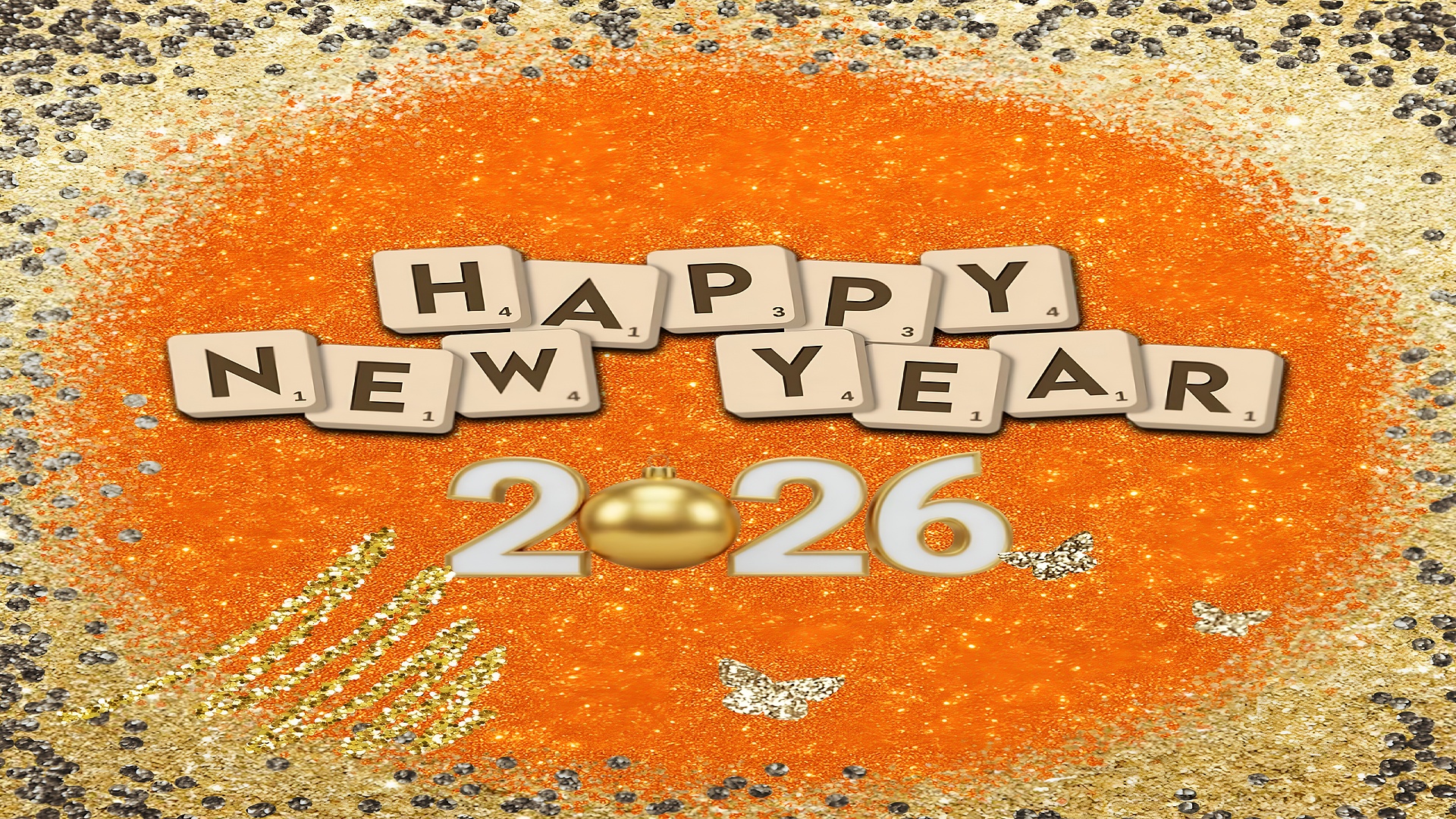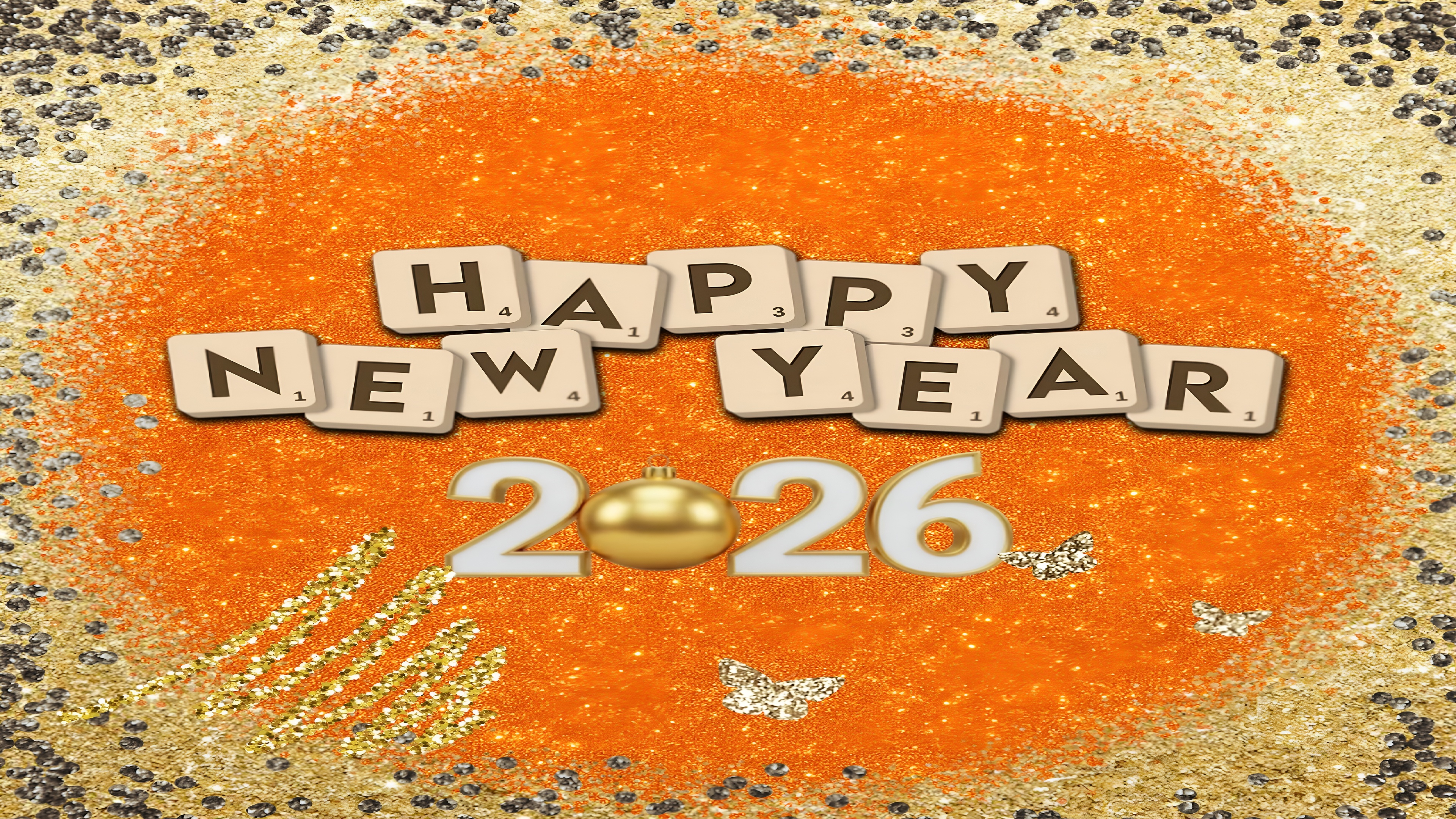 This Happy New Year 2026 Celebration Wallpaper radiates festive cheer and vibrant energy, perfect for welcoming the upcoming year with style and warmth. The main subject features the phrase "Happy New Year" spelled out with Scrabble-style letter tiles, arranged playfully over a dazzling orange glitter background. Below the greeting, the year "2026" is prominently displayed with a golden ornament replacing the zero, adding a touch of elegance and holiday spirit. The wallpaper’s rich palette of vibrant orange, sparkling gold, metallic gold, and shimmering silver creates a luxurious and joyful atmosphere that instantly uplifts any desktop or mobile screen.