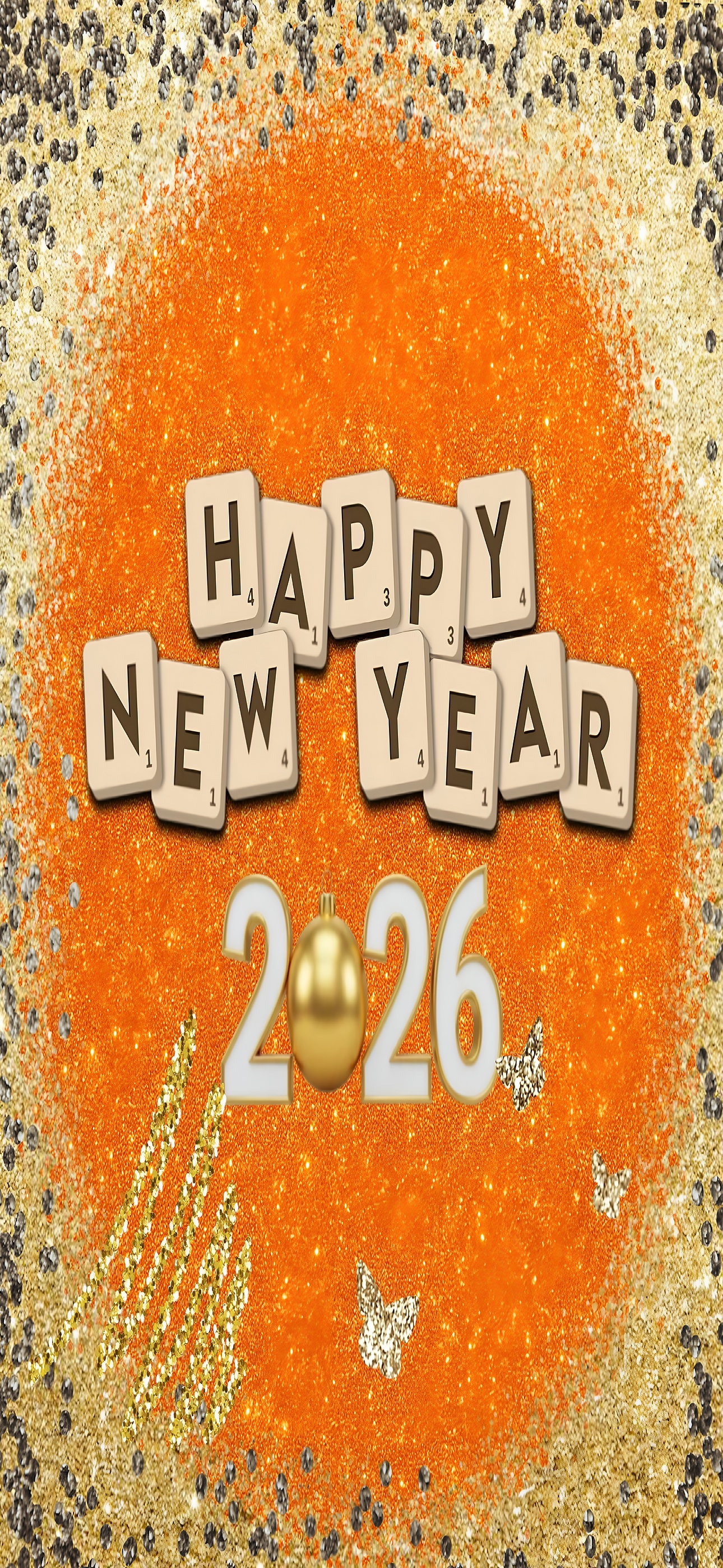 The wallpaper’s glittering gold and silver butterflies, along with the shimmering orange and metallic gold hues, create a luxurious holiday ambiance that fits perfectly with New Year celebrations. This festive wall art is ideal for those seeking high-definition backgrounds that combine joyful typography with decorative sparkle. The golden ornament in the year 2026 adds a unique cultural touch, symbolizing holiday ornaments and festive decorations. This wallpaper blends perfectly with seasonal themes, holiday greetings, and celebratory moods, making it a top choice for premium holiday wallpapers and festive digital art collections.
