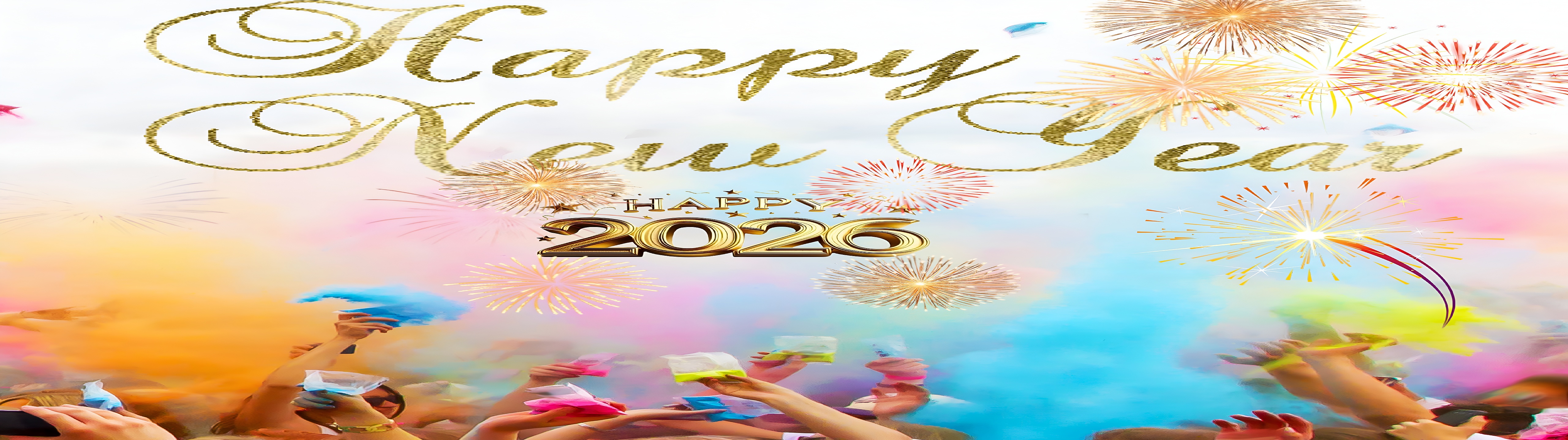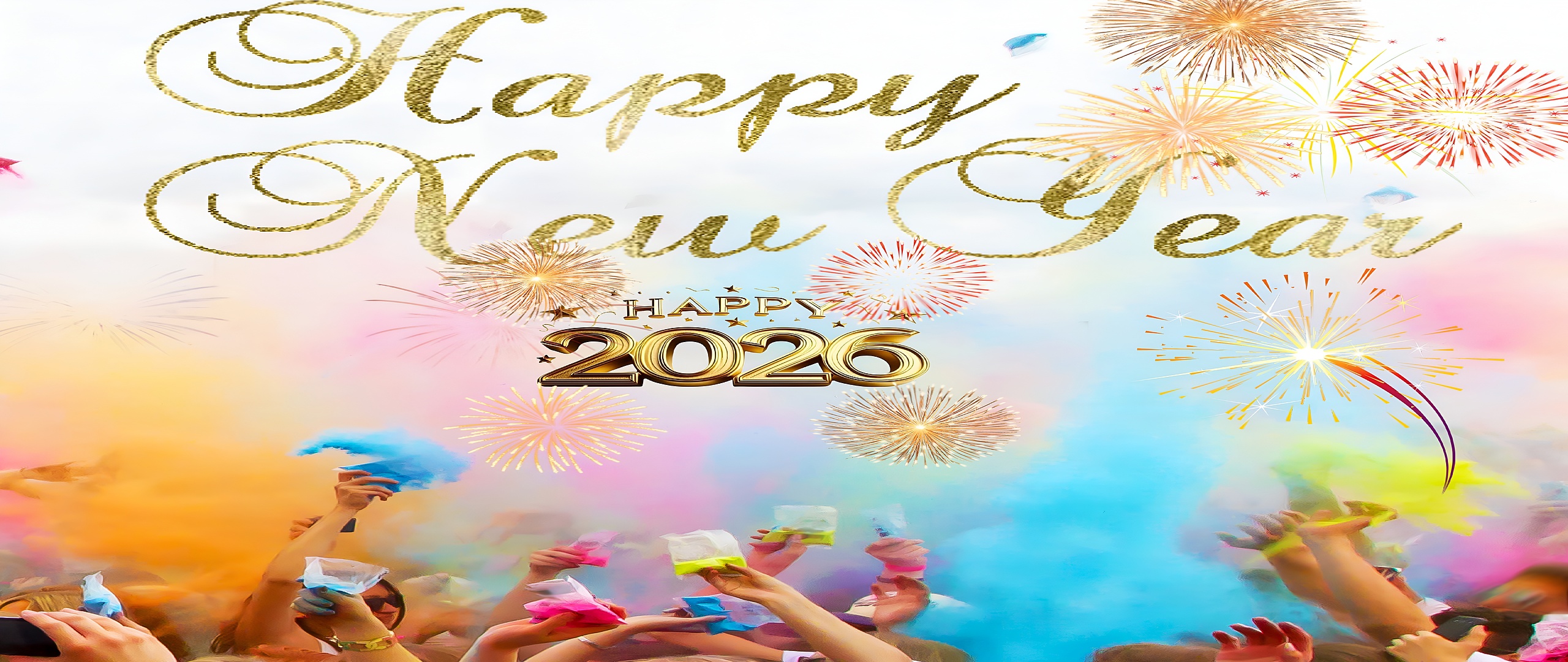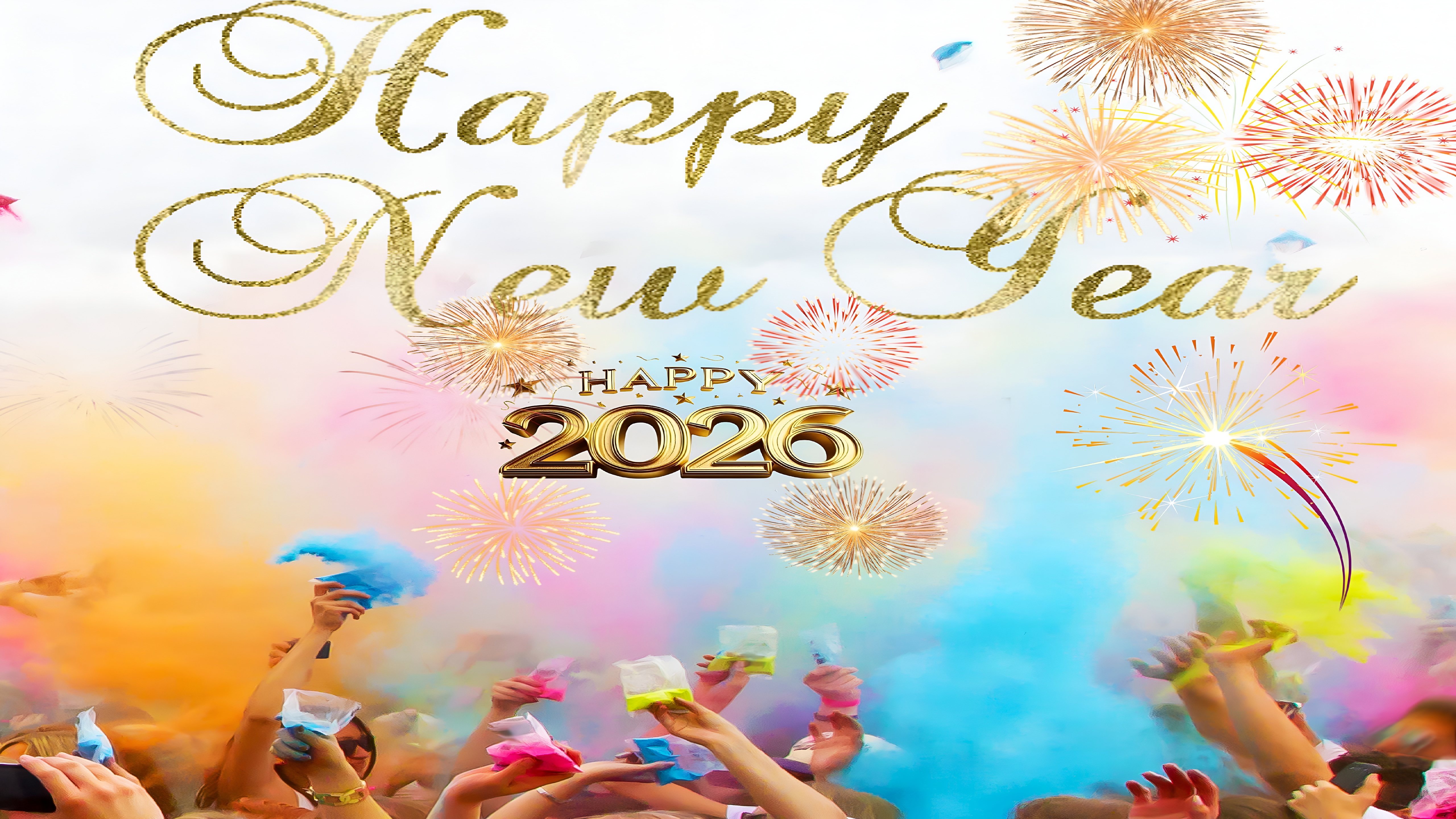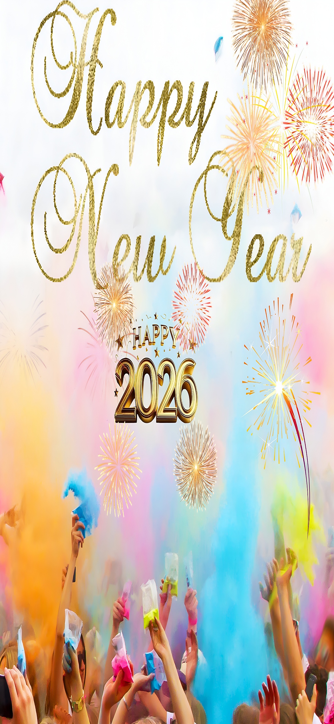 This Happy New Year 2026 Celebration Wallpaper captures the exhilarating spirit of a colorful festival, perfectly suited for welcoming the new year with joy and excitement. The image features a lively crowd raising their hands and throwing vibrant colored powders into the air, creating a dynamic and energetic atmosphere. The golden glittery text "Happy New Year" elegantly crowns the scene, while the bold, metallic gold "2026" stands out prominently in the center, surrounded by sparkling fireworks that add a magical touch to the composition. This wallpaper is a perfect blend of celebration and color, designed to brighten any desktop or mobile screen.