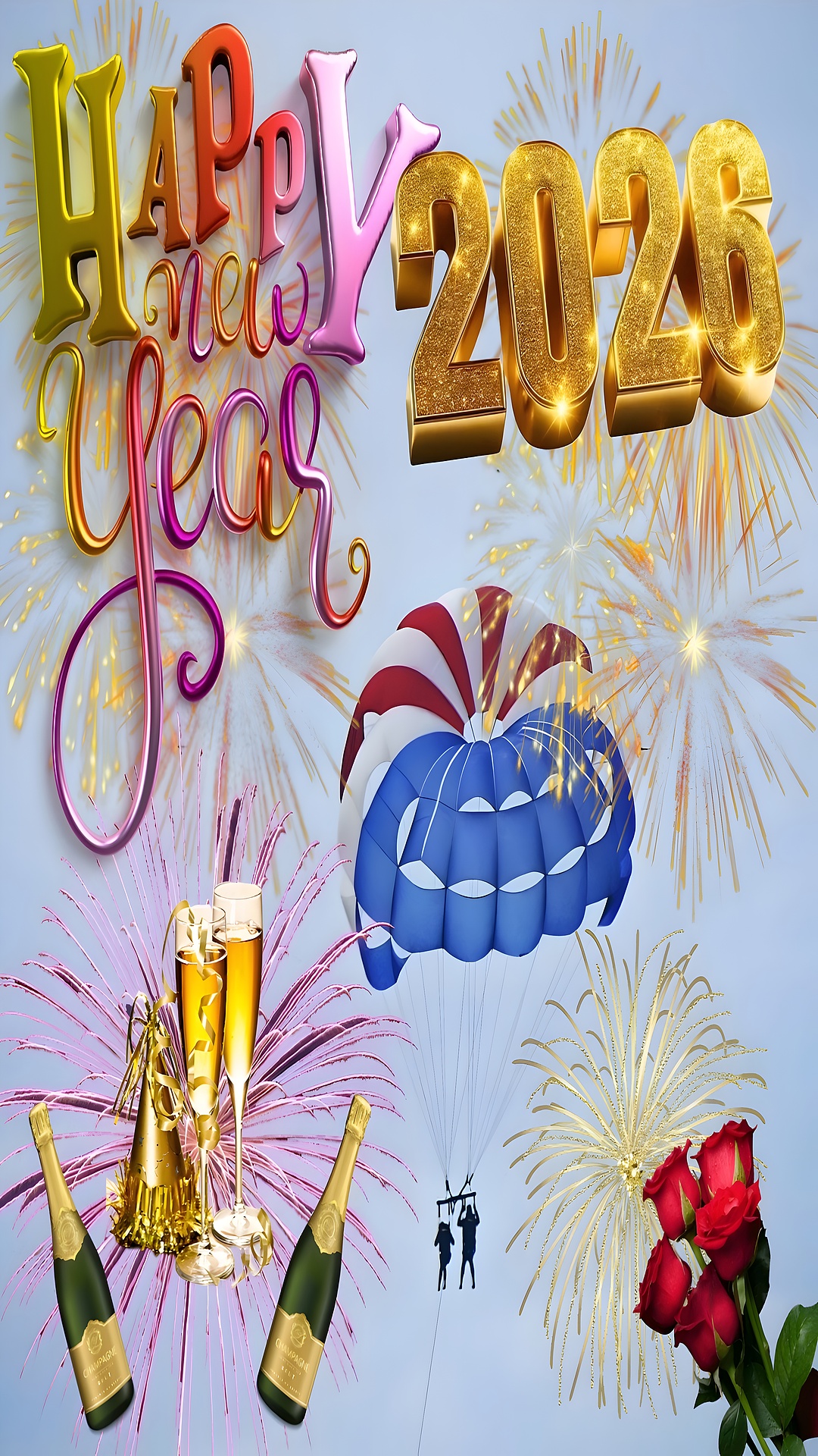 This HD wallpaper captures the festive spirit of welcoming 2026 with dazzling energy. The central message, “Happy New Year 2026,” bursts in vivid colors—orange, red, green, yellow, and gold—set against a backdrop of radiant fireworks. The golden “2026” adds a luxurious touch, while champagne bottles, flutes, and golden party hats evoke a joyful toast to new beginnings. A romantic bouquet of red roses softens the scene, and the parachuting duo adds a sense of adventure and thrill. Perfect for those who love celebrating with flair, this wallpaper blends excitement, romance, and elegance in one dynamic composition. Ideal for mobile screens, it brings the New Year’s joy right to your fingertips.