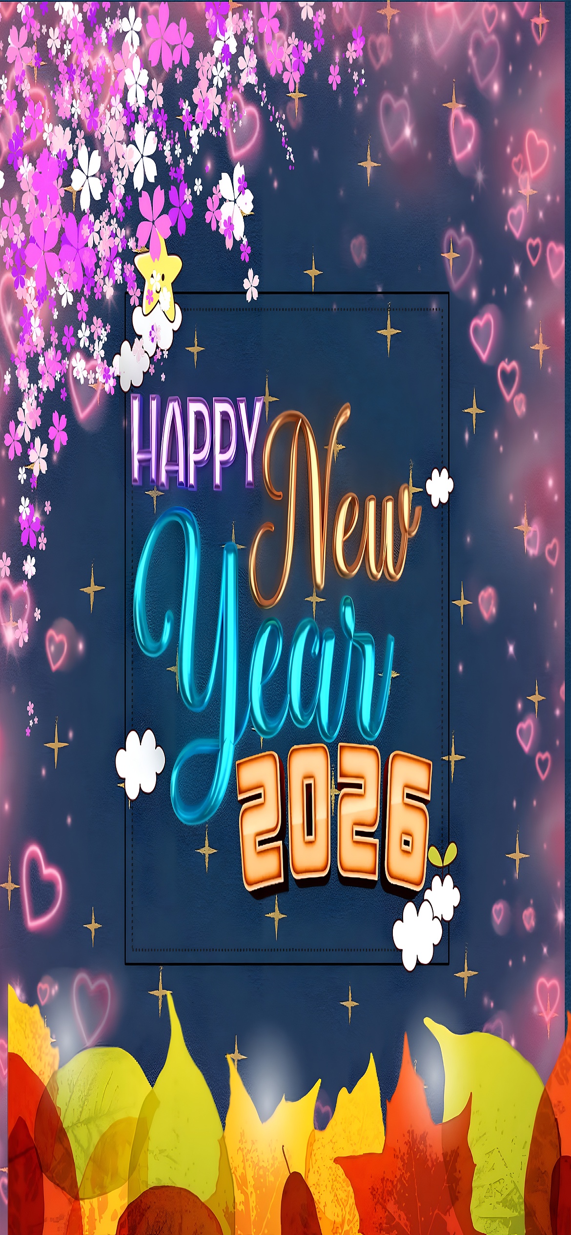 New year festive floral this HD wallpaper titled Happy New Year 2026 bursts with festive energy and cheerful design. Set against a deep blue backdrop, the stylized typography in purple, gold, and orange radiates celebration. Surrounding the text are whimsical elements—pink and white flowers, golden stars, heart shapes, and playful clouds—that add charm and warmth. Autumn leaves in red, orange, and yellow line the bottom, grounding the composition with seasonal flair. Perfect for welcoming the new year, this wallpaper brings a joyful, artistic touch to your screen. Ideal for mobile users who love colorful, holiday-themed visuals.