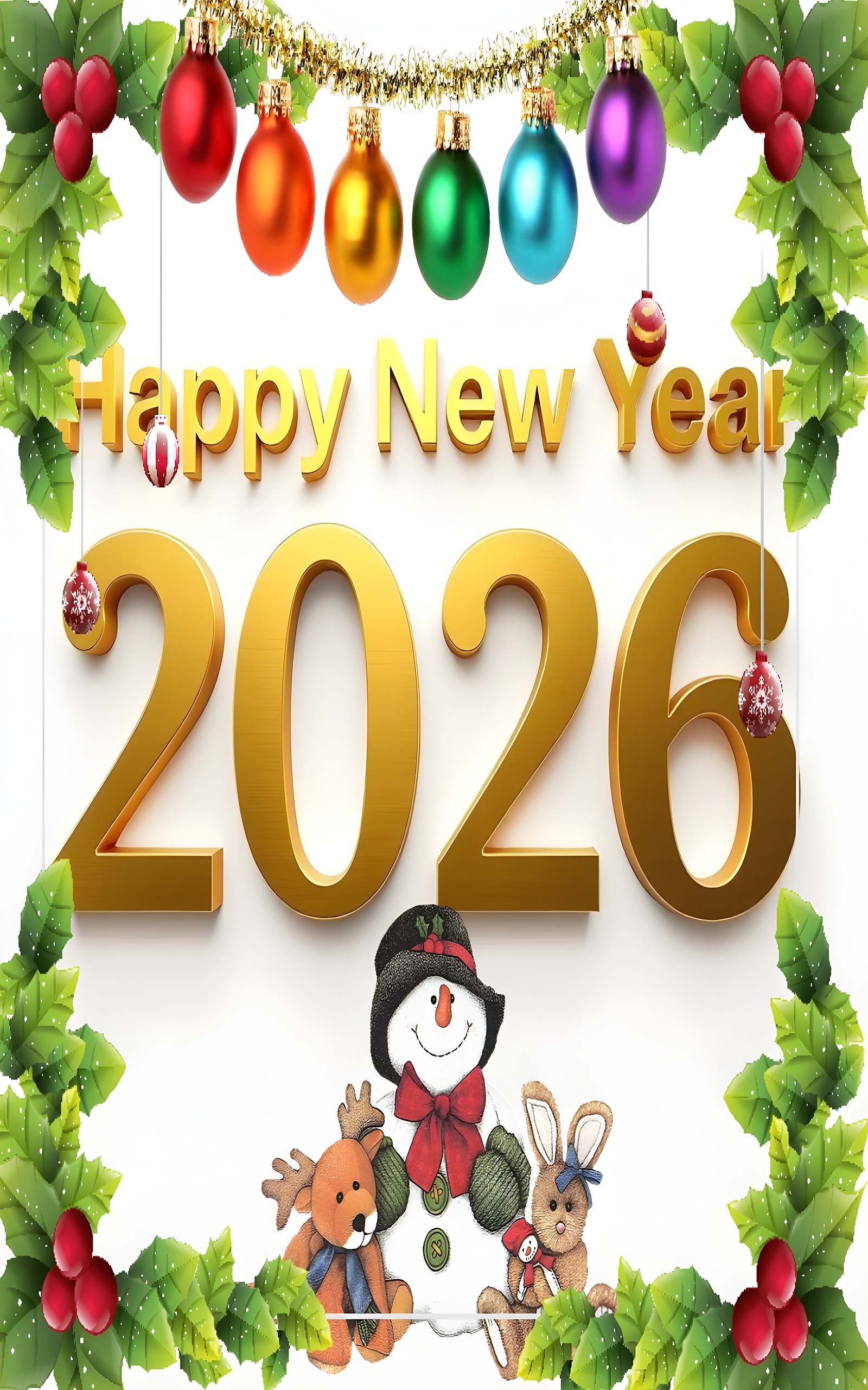 As we usher in the New Year, the 'Happy New Year 2026 Festive Wallpaper' captures the essence of celebration and joy. This vibrant wallpaper features a cheerful snowman surrounded by adorable animals, all set against a backdrop of lush green holly leaves. The golden '2026' stands out prominently, symbolizing new beginnings and the excitement that comes with a fresh start. The colorful ornaments hanging above add a playful touch, making this wallpaper perfect for anyone looking to embrace the festive spirit.