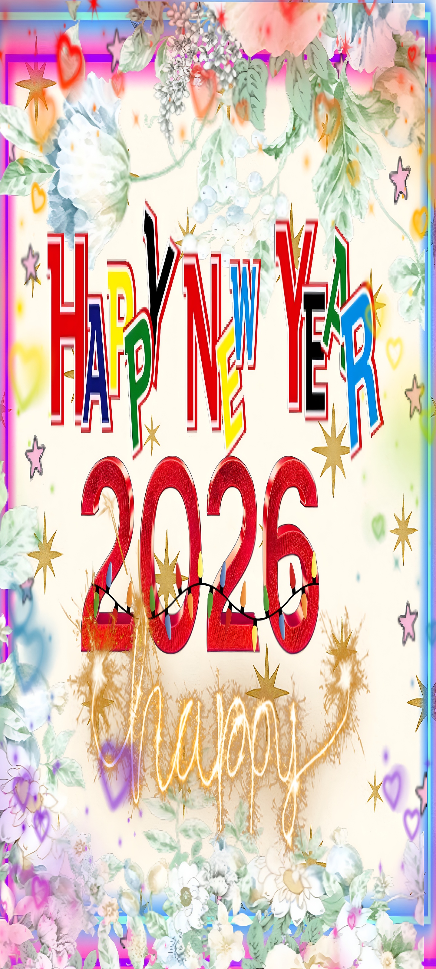 This vibrant HD wallpaper features the cheerful message “HAPPY NEW YEAR 2026” in bold, multicolored letters, set against a lively background of stars, hearts, floral patterns, and glowing accents. The playful typography and glowing cursive “happy” beneath the year add a whimsical touch, making it perfect for spreading positivity and celebration. The string of holiday lights wrapped around the red “2026” enhances the festive mood, while the pastel and vivid tones create a joyful atmosphere. Ideal for those who love colorful, holiday-themed designs, this wallpaper brings the spirit of the New Year right to your screen.