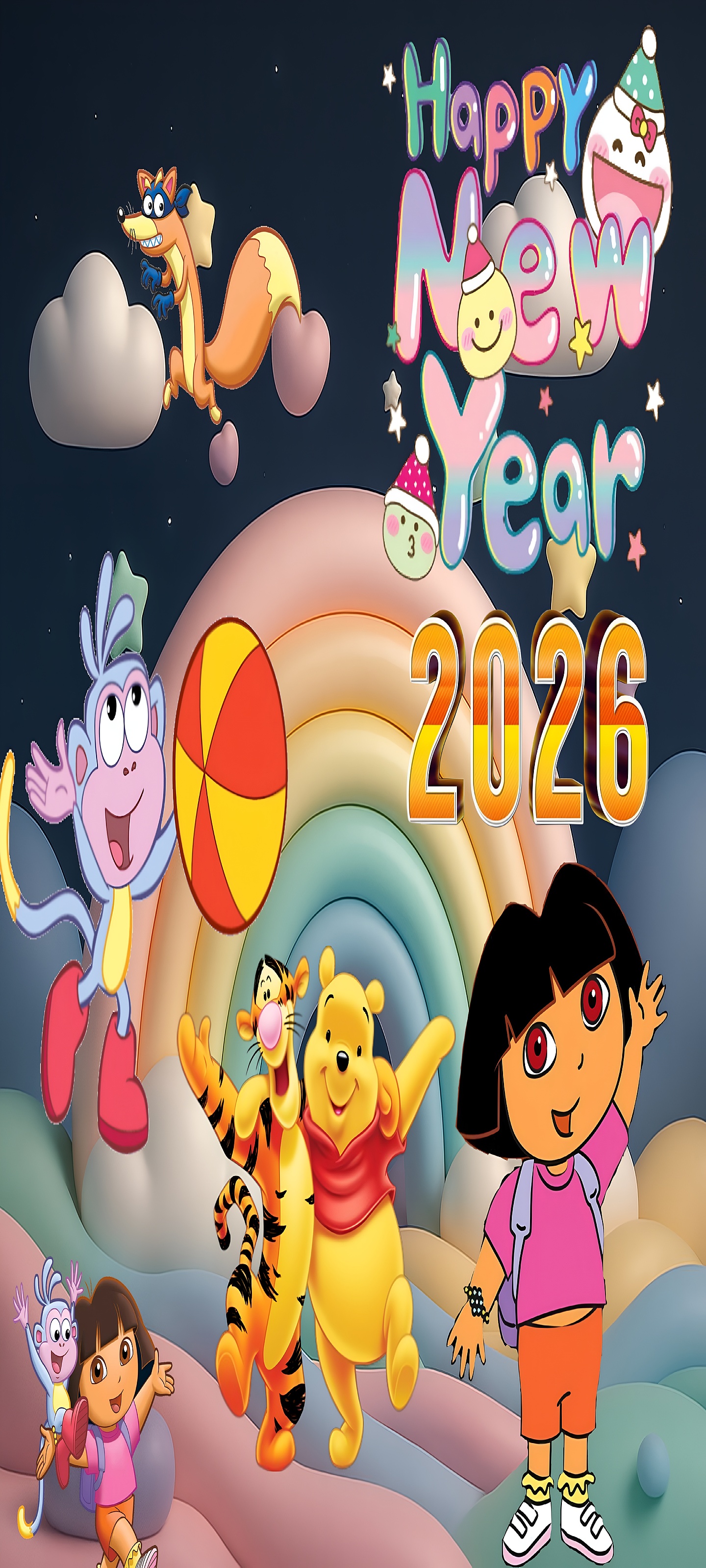 Welcome the New Year with joy and color through this Happy new year cartoon HD wallpaper titled Happy New Year 2026 – Festive Cartoon Celebration. Set in a dreamy pastel rainbow landscape under a starry sky, this vibrant illustration features beloved animated characters like Dora the Explorer, Boots, Winnie the Pooh, Tigger, and Swiper the Fox.