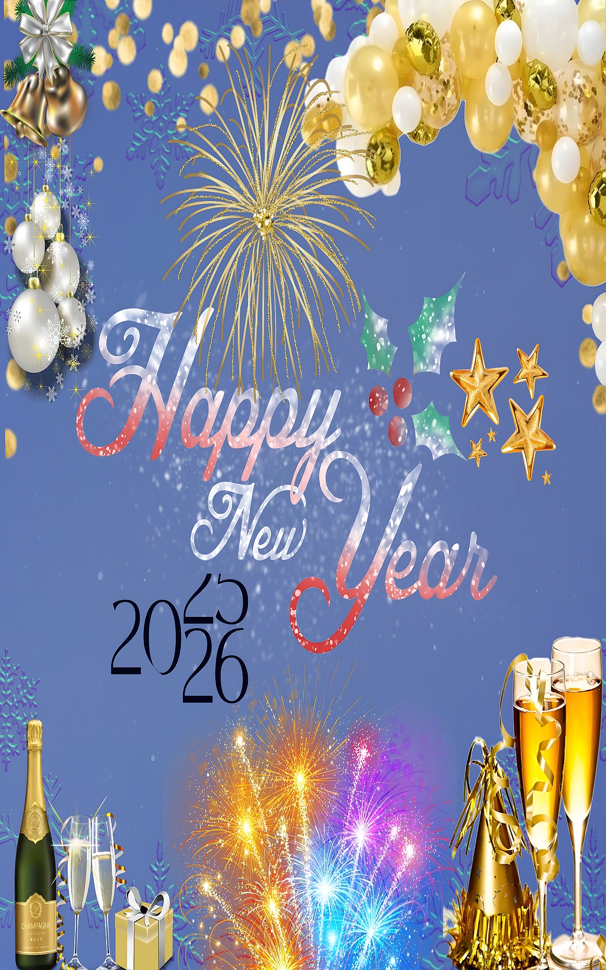 This premium HD wallpaper also includes detailed decorative elements such as clusters of gold and white balloons, golden stars, and holly leaves with red berries, adding a festive holiday spirit. Champagne bottles and flutes filled with bubbly golden liquid appear on both sides, symbolizing celebration and luxury. The overall composition is balanced and festive, with a mix of textures from smooth balloons to glittering fireworks, creating a lively and warm atmosphere. The original resolution of 5760×5760 ensures crisp, clear visuals on a wide range of devices, from large 27-inch 4K monitors to high-end tablets like the iPad Pro 12.9-inch and smartphones such as the iPhone 15 Plus.