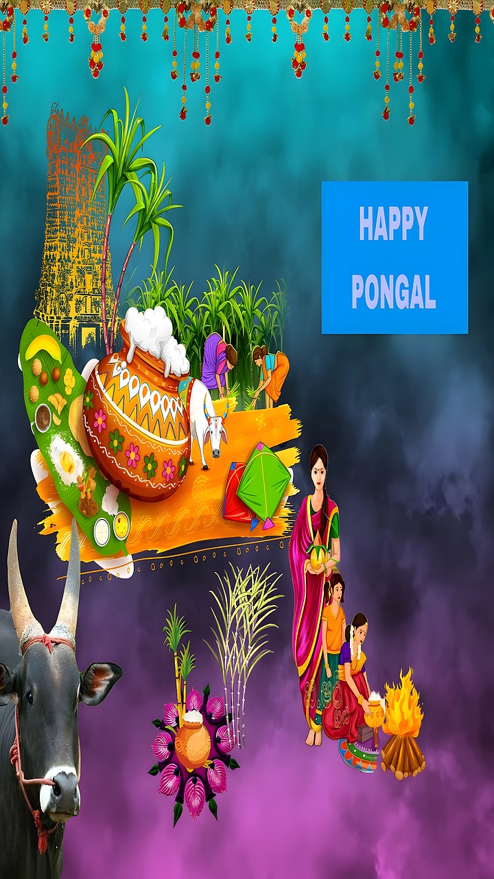 This Happy Pongal Festival Celebration HD wallpaper beautifully captures the essence of the traditional South Indian harvest festival, Pongal. The main subject is a colorful and festive arrangement featuring a decorated clay pot overflowing with boiling rice, symbolizing prosperity and abundance. Surrounding the pot are iconic elements such as sugarcane stalks, a white cow, and a traditional banana leaf meal, all set against a rich, gradient background blending vibrant orange, deep purple, and teal hues. The artwork also depicts women and children engaging in customary rituals near a ceremonial fire, emphasizing the communal and familial spirit of the festival. The presence of a temple tower silhouette in golden yellow adds a spiritual dimension, while hanging floral decorations at the top frame the scene with festive charm.