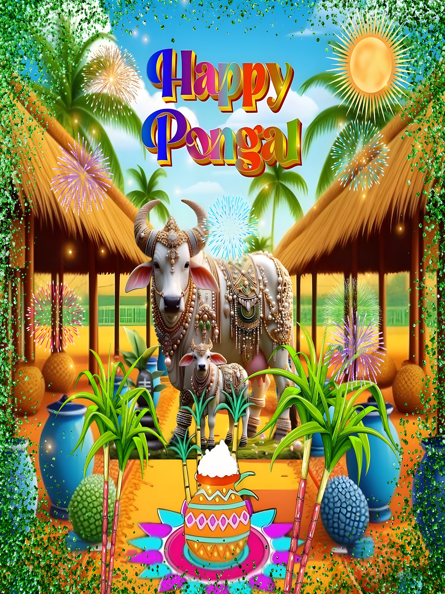 Celebrate the spirit of the Indian harvest festival with this stunning Happy Pongal Festival HD Wallpaper. The image captures a beautifully decorated bull and calf adorned with traditional jewelry and garlands, symbolizing prosperity and gratitude during the Pongal festivities. Set against a bright blue sky and surrounded by lush green palm trees and golden thatched huts, this wallpaper radiates warmth and cultural richness. The vibrant colors and intricate details create a lively atmosphere that perfectly embodies the joyous mood of this important South Indian celebration.