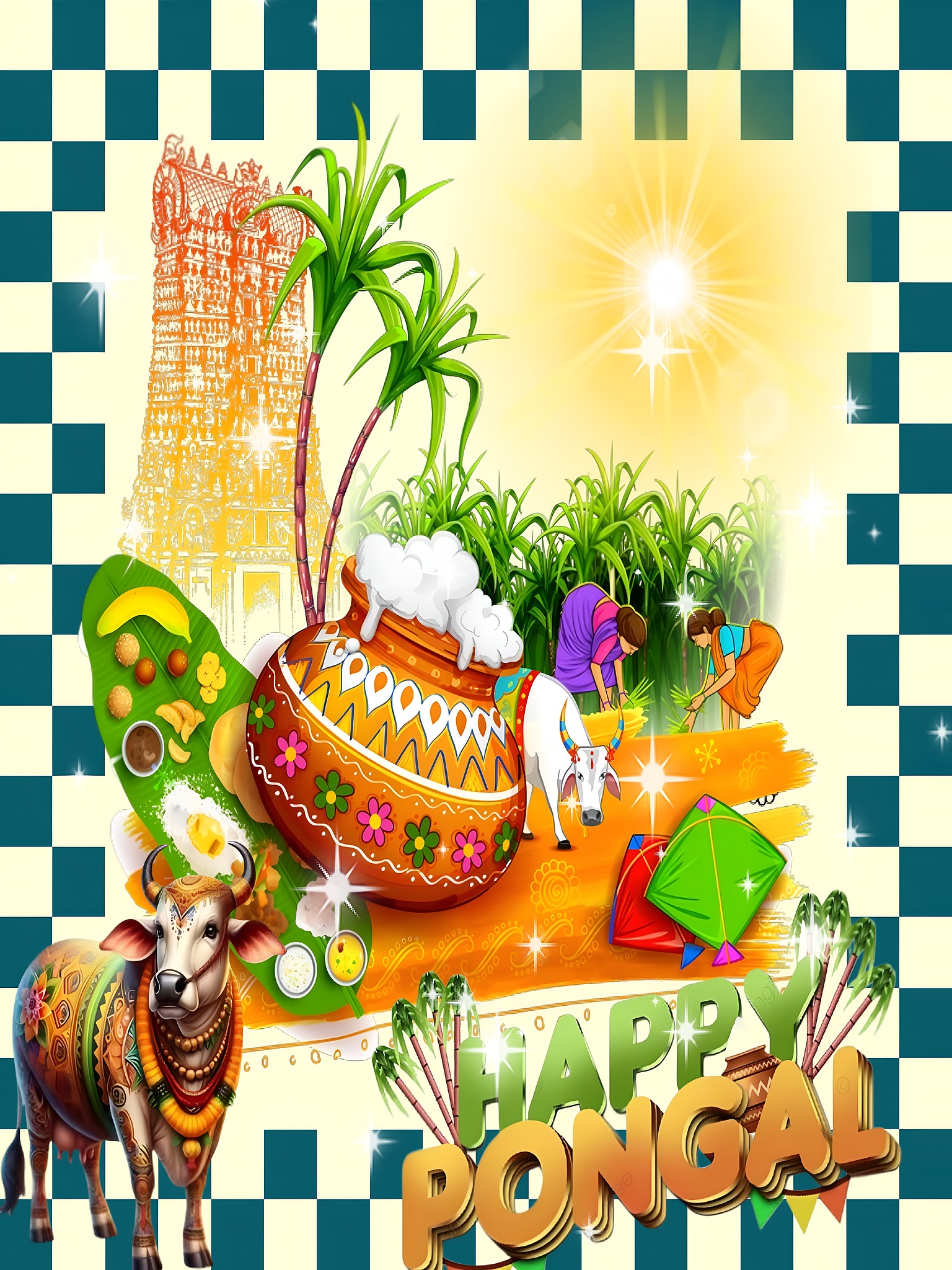 The wallpaper’s palette is dominated by vibrant orange, lush green, bright yellow, and deep blue, creating a warm and joyful atmosphere that reflects the spirit of Pongal. Decorative elements such as traditional South Indian sweets on a banana leaf, colorful kites, and sparkling light effects add layers of cultural symbolism and festivity. The checkerboard border in deep blue and cream frames the composition, enhancing its visual appeal and making it perfect for a high-resolution wallpaper. This artwork conveys a mood of celebration, gratitude, and cultural pride, making it an ideal desktop background or mobile wallpaper for those who appreciate vibrant festival art.