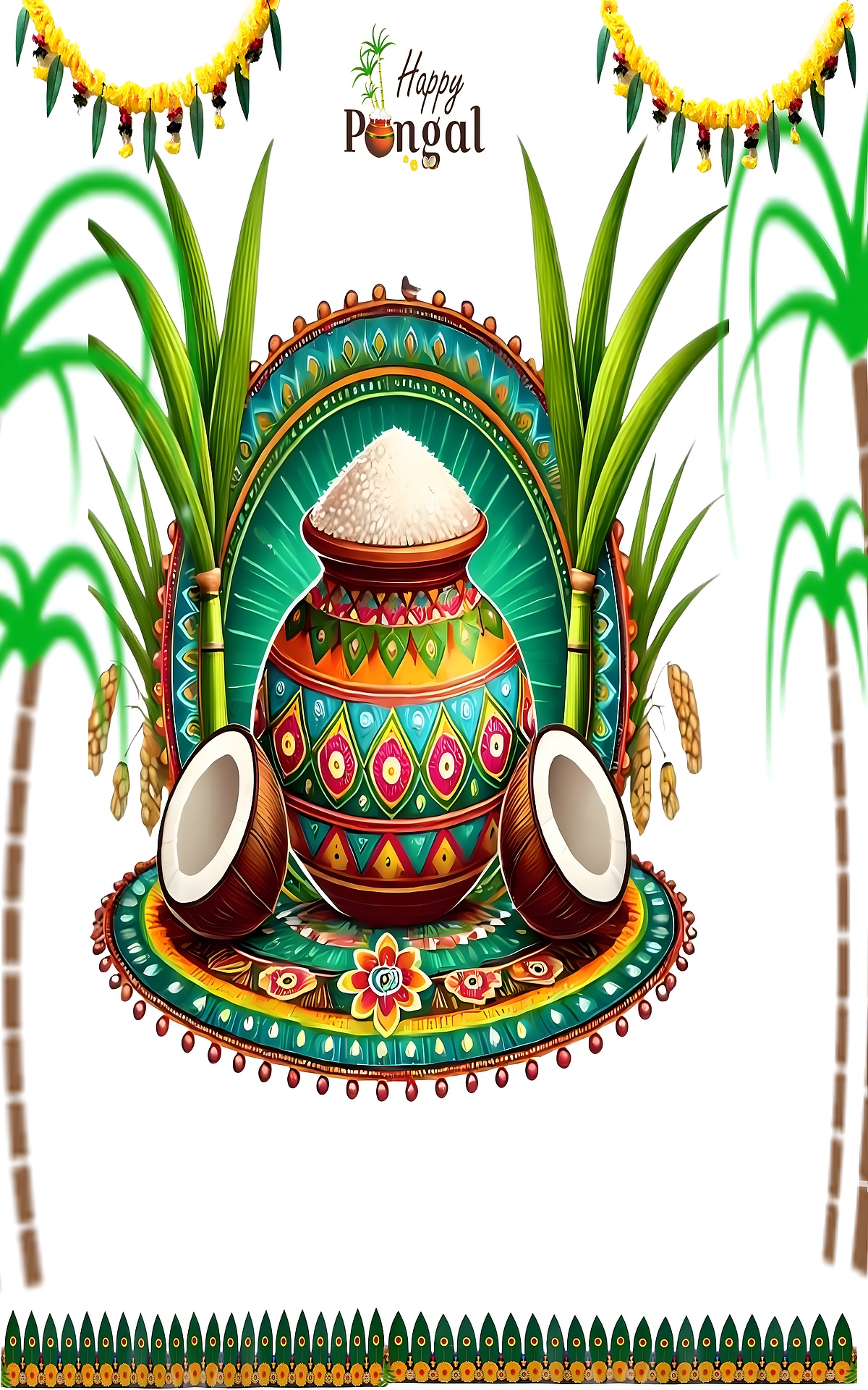 Celebrate the spirit of the South Indian harvest festival with this stunning Happy Pongal Festival HD Wallpaper. The central focus is a beautifully decorated traditional clay pot brimming with freshly cooked rice, symbolizing prosperity and abundance. The pot is adorned with intricate geometric patterns in vibrant teal, warm orange, and bright yellow hues, creating a lively and festive atmosphere. Surrounding the pot are two halved coconuts and tall green sugarcane stalks, essential elements of the Pongal celebration, all set against a clean white background that accentuates the vivid colors and intricate details.