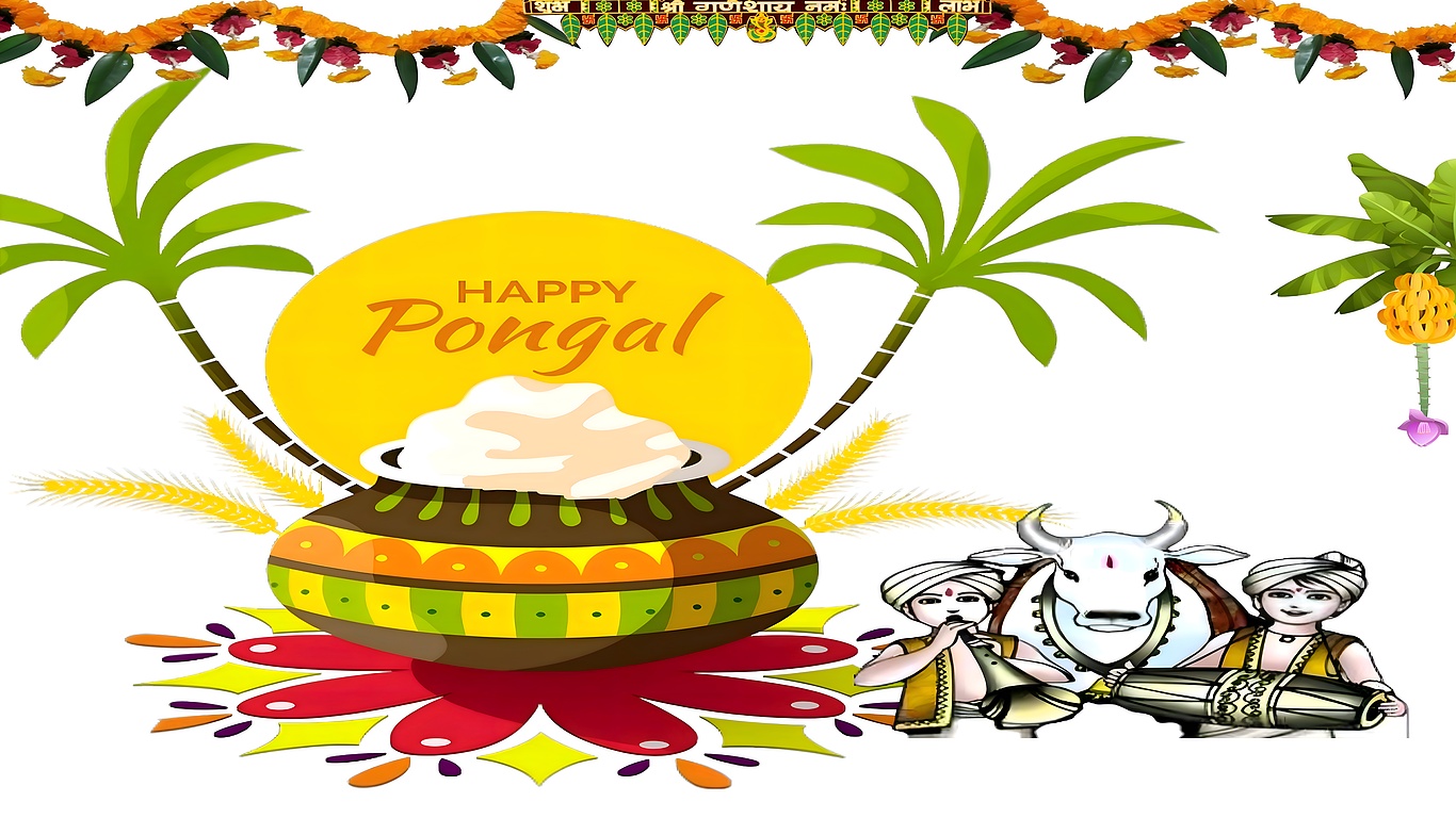 The illustration also features two traditionally dressed farmers playing musical instruments alongside a white bull, which is revered during the festival. The bull is adorned with a red tilak on its forehead, reflecting cultural reverence and the close bond between farmers and their livestock. The top border is decorated with marigold flower garlands and green leaves, enhancing the festive atmosphere. This premium HD wallpaper blends warm orange, bright yellow, vibrant green, and deep red hues to create an inviting and joyful mood, perfect for anyone looking to celebrate Pongal through wall art.