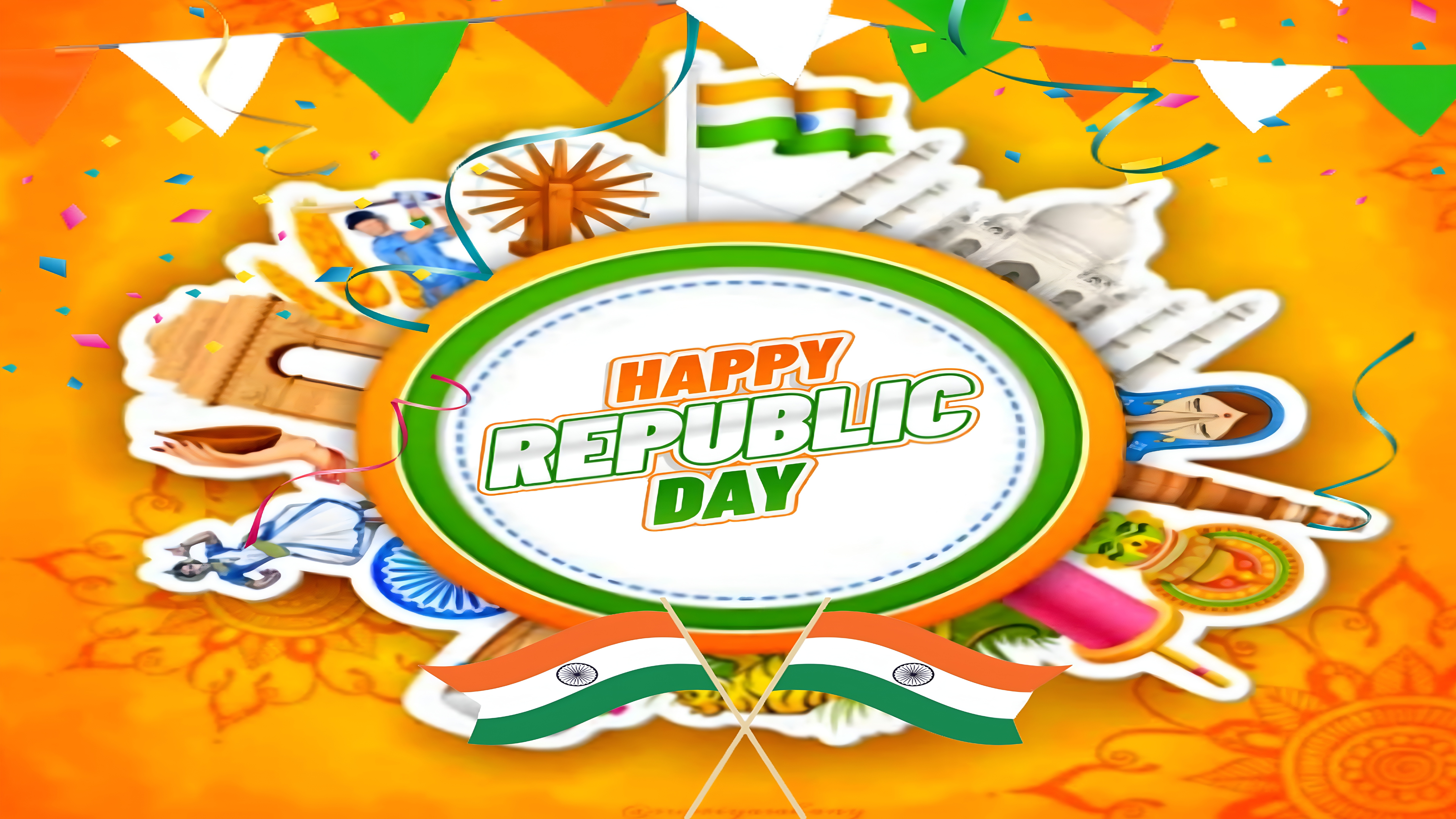 This Happy Republic Day Celebration Art wallpaper beautifully integrates key Indian cultural icons like the Taj Mahal, the Ashoka Chakra, and traditional dancers, making it a perfect tribute to India's rich heritage. The use of the Indian tricolor flags and the spinning wheel symbolizes freedom and unity, essential themes in Republic Day celebrations. The vibrant orange background with festive confetti and streamers enhances the mood, making this wallpaper suitable for festive occasions and patriotic displays. Whether you want a desktop background or mobile wallpaper that reflects Indian pride, this design offers a high-definition, visually engaging option.