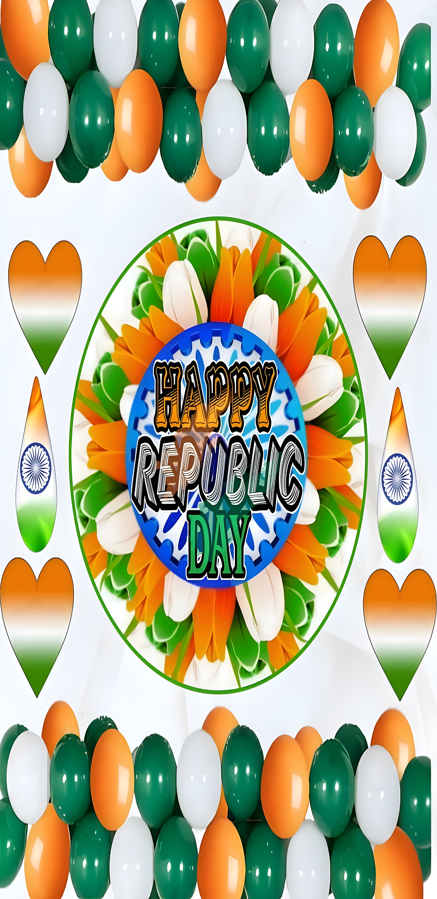 This Happy Republic Day Celebration Wallpaper beautifully captures the spirit of Indian national pride with a vibrant and festive design. The main subject is a circular floral arrangement composed of petals in saffron orange, white, and India green, symbolizing the colors of the Indian flag. At the center of this arrangement is a bold, colorful emblem featuring the words "HAPPY REPUBLIC DAY" overlaid on a stylized Ashoka Chakra in navy blue, which is a key symbol of India's heritage. Surrounding this central motif are heart shapes and teardrop designs filled with the Indian tricolor and Ashoka Chakra, enhancing the patriotic theme.
