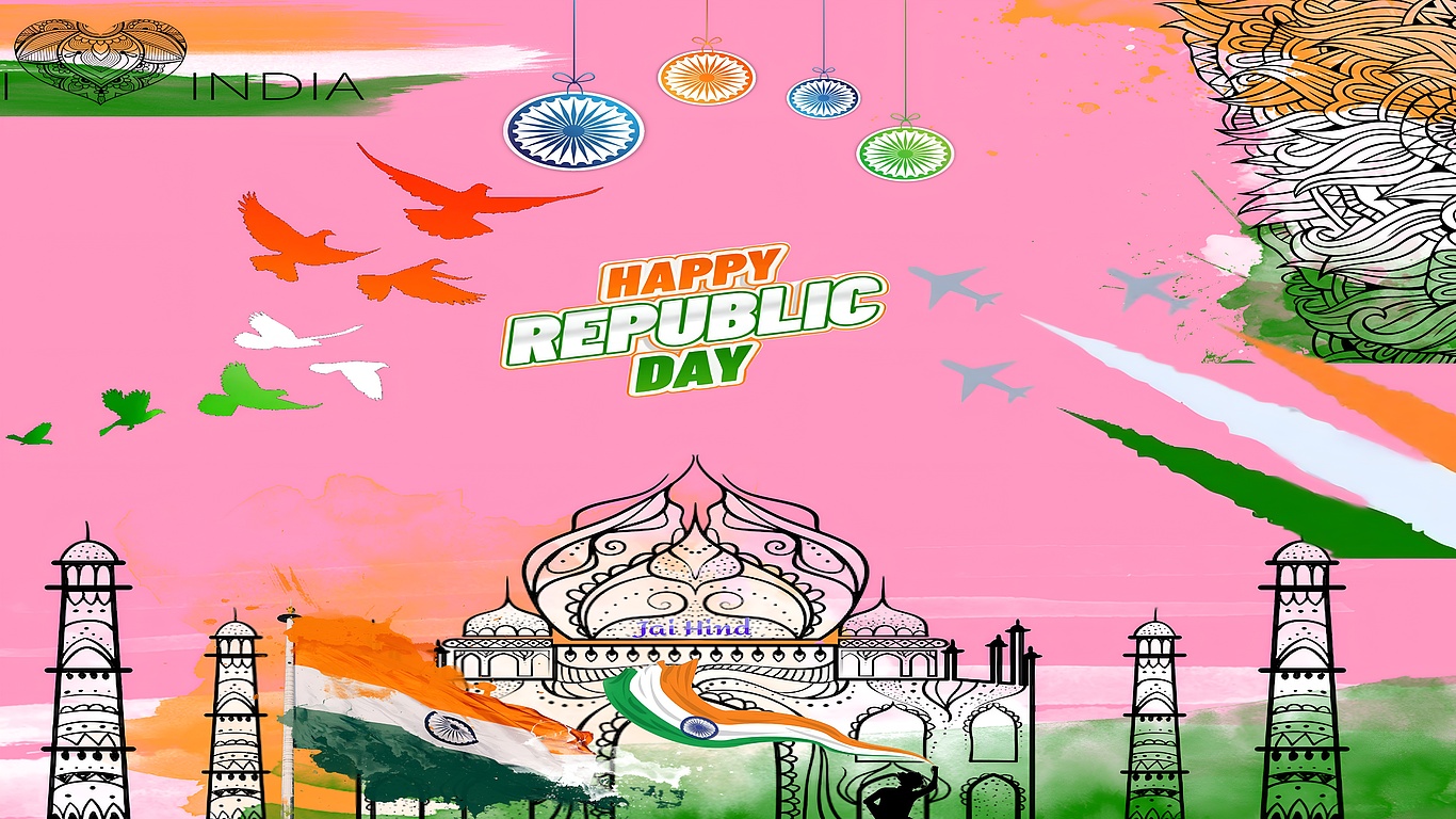 This Happy Republic Day India Art wallpaper blends traditional Indian cultural symbols with modern graphic design, featuring a vibrant pink backdrop and the iconic tricolor palette of saffron, white, and green. The intricate monument sketch and flying birds create a festive and patriotic atmosphere, making it a standout choice for anyone looking to celebrate India's Republic Day with style and high-resolution clarity.