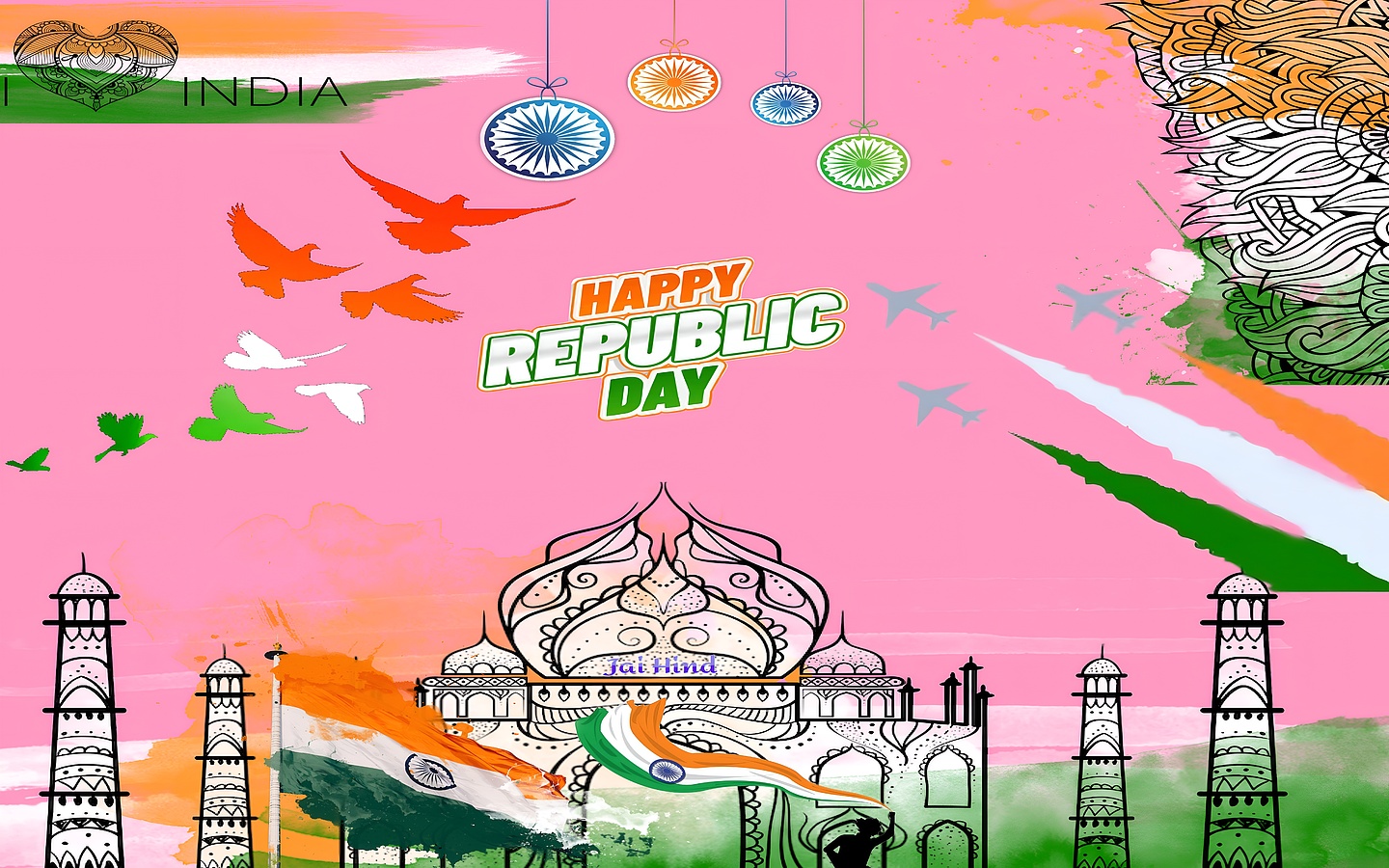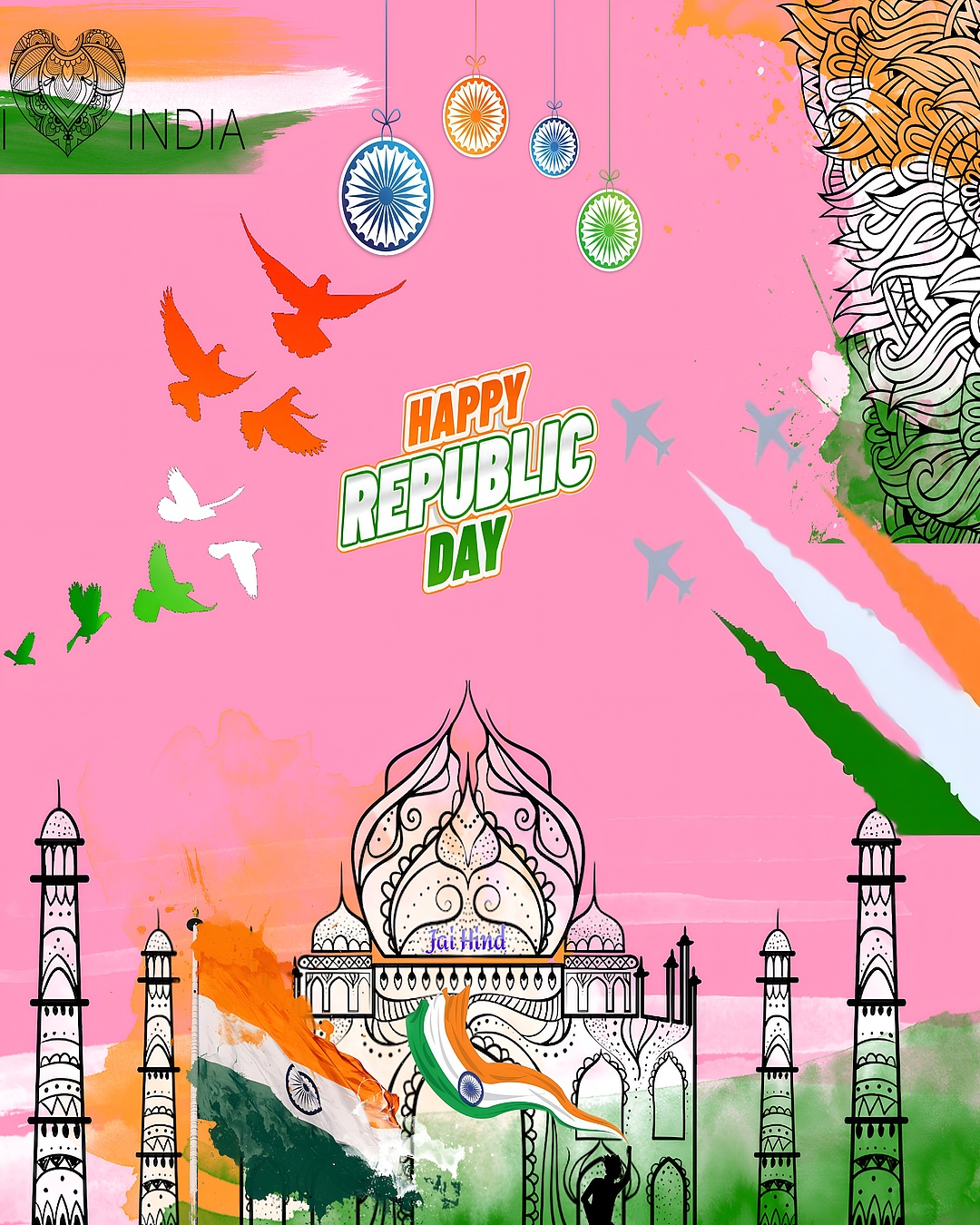 This high-resolution wallpaper features a harmonious blend of saffron orange, white, and India green—the colors of the Indian flag—set against a striking pink background that adds a modern and festive twist. The intricate black line art of the monument reflects traditional Indian architecture and cultural heritage, while the mandala patterns add a spiritual and decorative touch. The flying birds symbolize freedom and hope, and the presence of fighter jets with colored smoke trails highlights the patriotic celebrations associated with Republic Day. This wallpaper is ideal for desktop backgrounds, mobile wallpapers, and wall art that celebrate Indian culture with a contemporary flair.