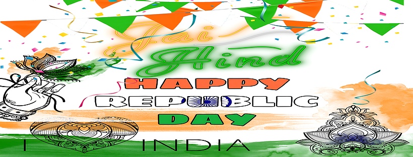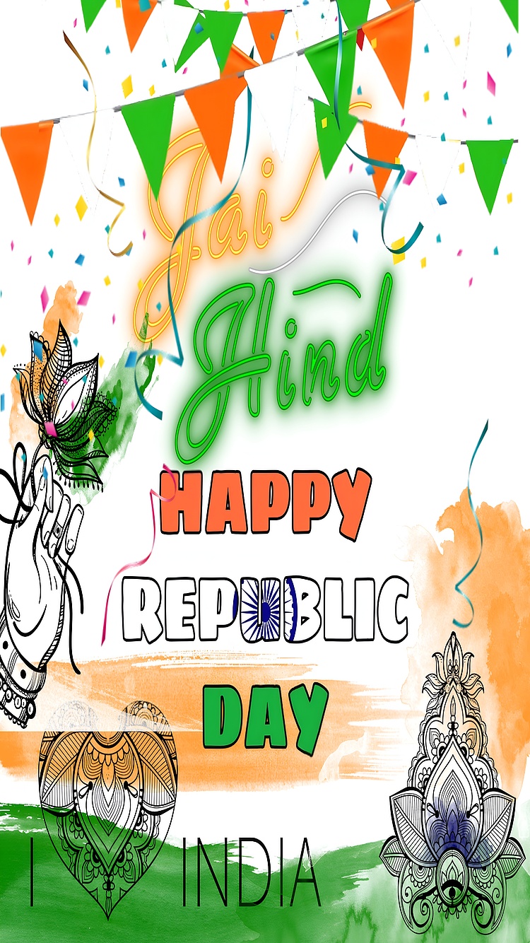 This Happy Republic Day India Wallpaper beautifully captures the spirit of Indian patriotism through a vibrant and festive digital artwork. The main subject is a colorful celebration scene featuring the iconic Indian tricolor palette of saffron orange, deep green, and white, complemented by navy blue accents. The design prominently displays the phrase “Happy Republic Day” with artistic typography that blends neon-style glowing text and bold block letters, creating a lively and eye-catching focal point. Surrounding the text, delicate hand-drawn elements such as a lotus flower held by a detailed hand and intricate mandala patterns add cultural depth and artistic elegance to the composition.