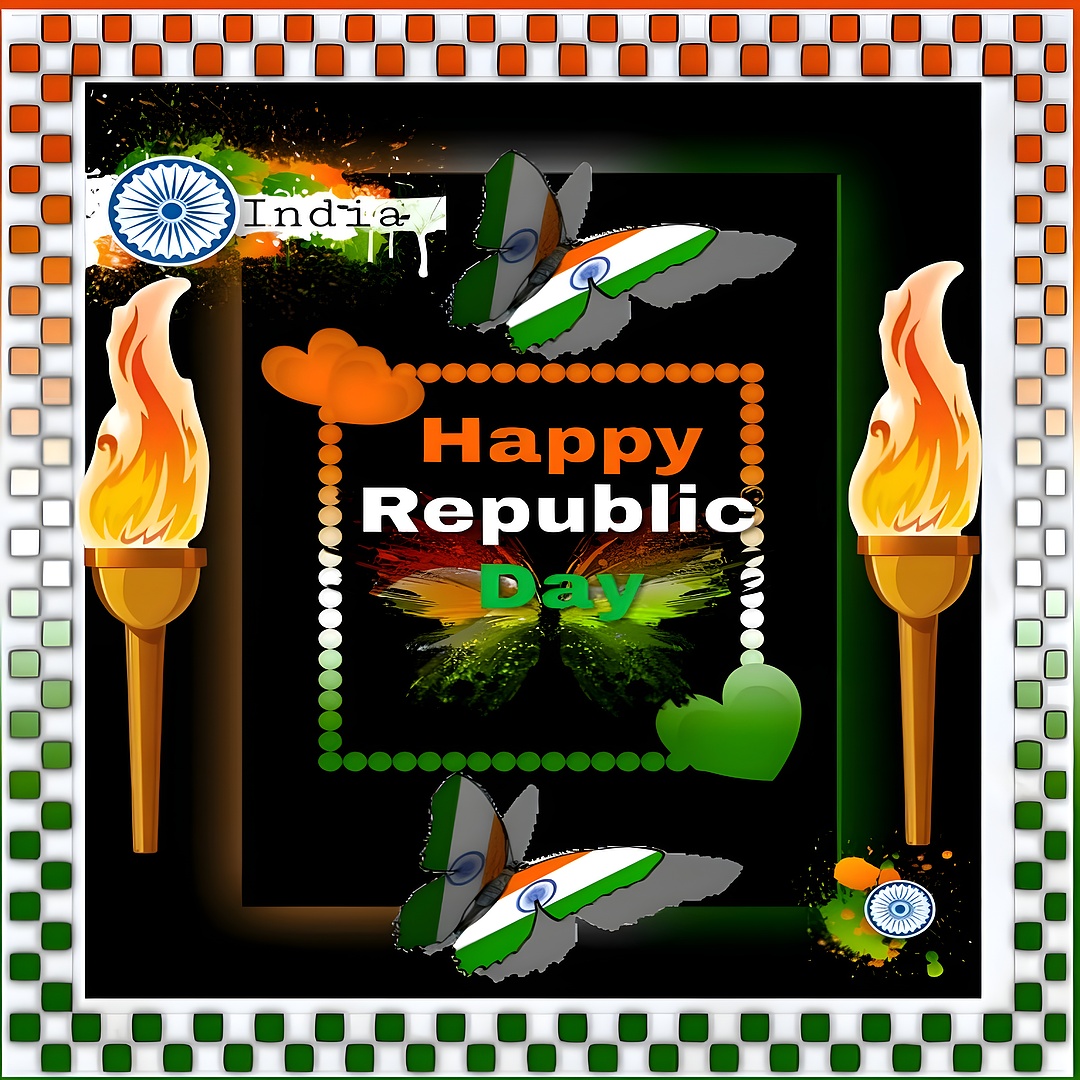 Celebrate the spirit of India with this vivid Happy Republic Day India Wallpaper, a perfect tribute to the nation's pride and heritage. This high-resolution wallpaper features a striking black background that highlights the vibrant saffron orange, white, and India green colors of the Indian flag, beautifully incorporated into butterflies and decorative elements. The design is framed with a unique checkered border in the tricolor palette, enhancing the festive and patriotic mood. The inclusion of flaming torches on either side adds a symbolic warmth and strength, evoking the enduring spirit of the Republic Day celebrations.