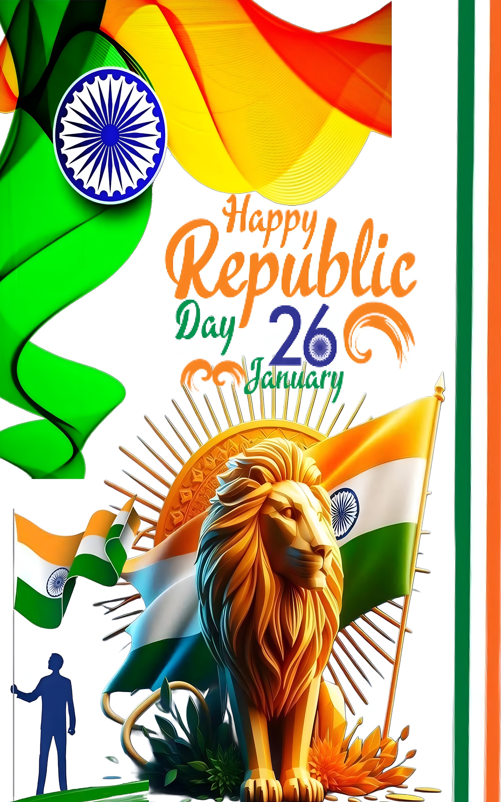 This wallpaper blends artistic elements with cultural symbolism, making it perfect for desktop backgrounds, mobile wallpapers, or wall art that honors India’s Republic Day. The original resolution of 4994×6642 ensures exceptional clarity and detail, ideal for large monitors and high-end devices. The 3:4 aspect ratio suits tablets and portrait-oriented displays, while the vibrant palette of saffron orange, white, India green, and navy blue creates a visually striking and harmonious design.