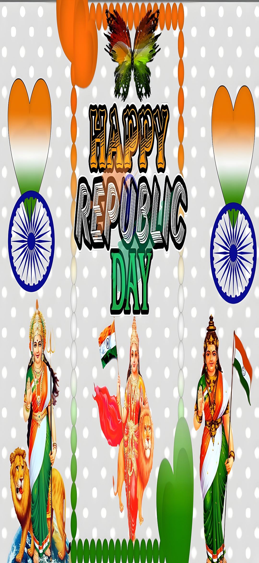 This vibrant Happy Republic Day Indian Art wallpaper beautifully captures the spirit of India's national celebration with a rich blend of cultural and patriotic symbolism. The central focus is a bold greeting text "HAPPY REPUBLIC DAY" rendered in a creative, multicolored style that incorporates the Indian tricolor—saffron orange, white, and green—along with navy blue accents. Surrounding the text are artistic elements such as hearts and circular motifs that echo the colors of the Indian flag, creating a festive and harmonious composition. The background features a subtle polka dot pattern in white and gray, adding texture without overwhelming the main subjects.