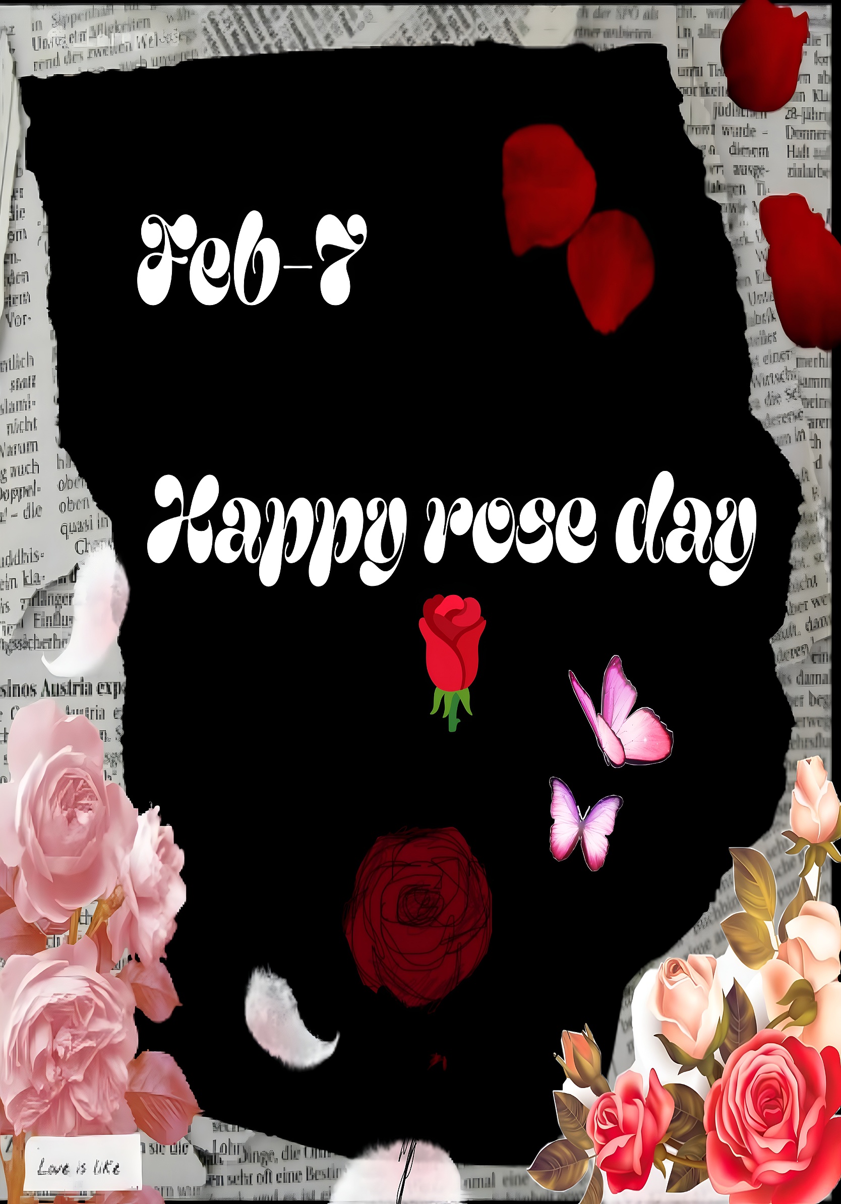 Celebrate the spirit of love and romance with this beautifully crafted Happy Rose Day Floral Art wallpaper. Featuring a striking black torn-paper effect background framed by delicate newspaper print edges, this design elegantly highlights the festive message "Feb-7 Happy rose day" in a charming, whimsical white font. The wallpaper is adorned with vibrant red and soft pink roses, scattered rose petals, and gentle pink butterflies, creating a warm and inviting atmosphere perfect for commemorating this special day dedicated to roses and affection.