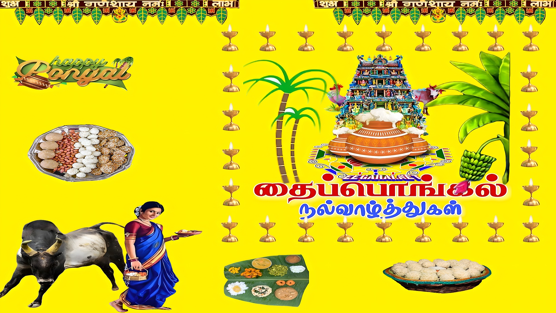 This vibrant Happy Thai Pongal Festival Art wallpaper beautifully captures the essence of the Tamil harvest festival, Pongal. The bright yellow background immediately draws attention, symbolizing energy, prosperity, and celebration. Central to the composition is a traditional Pongal pot overflowing with boiling rice, surrounded by colorful rangoli patterns and a detailed South Indian temple gopuram, highlighting the spiritual and cultural significance of the festival. The festive atmosphere is enhanced by rows of glowing oil lamps arranged symmetrically, creating a warm and inviting ambiance that reflects the joyous mood of Pongal.