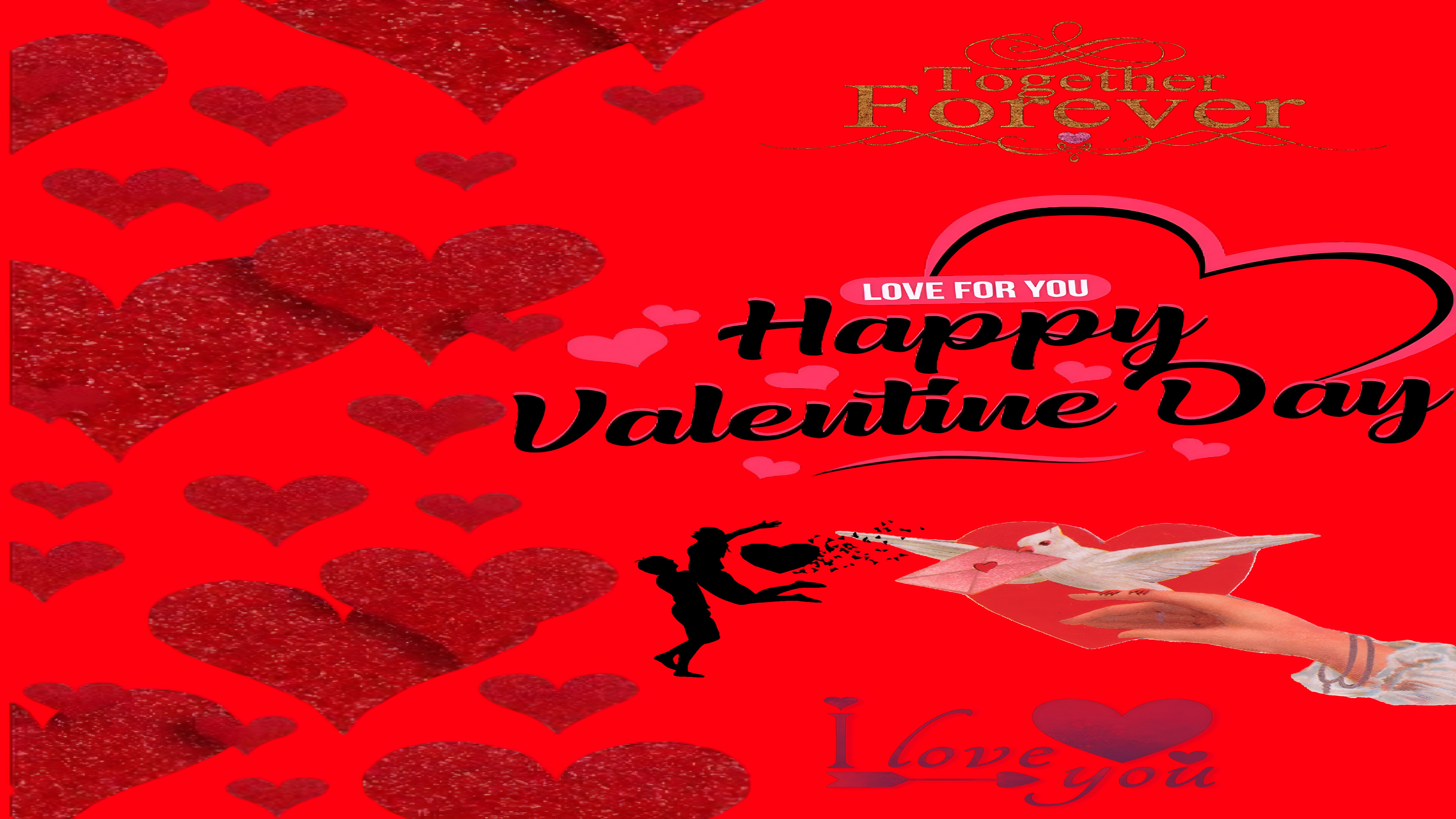 This Happy Valentine Day Romantic Art wallpaper captures the essence of love and togetherness with a vibrant and heartfelt design. The main subject is a bright red background adorned with glittery dark red hearts cascading down the left side, creating a rich and textured romantic atmosphere. Central to the composition is a large outlined heart framing the bold black script text "Happy Valentine Day" accompanied by a smaller "Love For You" tag, emphasizing the affectionate theme. A white dove holding a love letter in its beak perches delicately on a hand, symbolizing peace, love, and the exchange of heartfelt messages. The silhouette of a joyful couple adds a dynamic and playful touch, reinforcing the theme of romantic connection. The golden text "Together Forever" at the top adds a luxurious and timeless feel to the overall design.