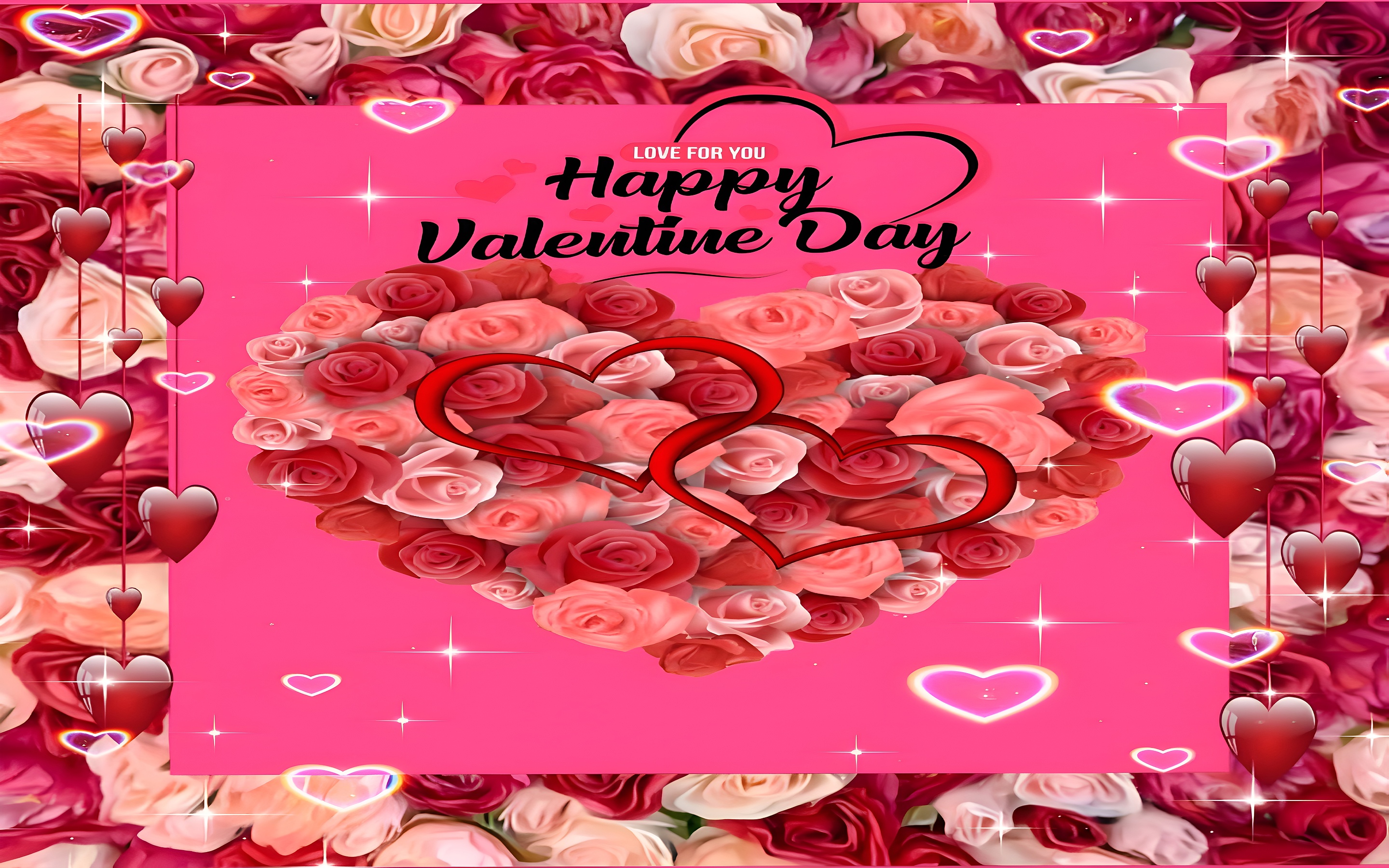 Celebrate the spirit of love with this stunning Happy Valentine Day Romantic Roses wallpaper, a perfect blend of vibrant pinks and deep reds that evoke warmth and affection. This high-resolution wallpaper features a heart-shaped bouquet of roses in shades of soft peach, warm coral, and rich red, set against a vivid pink background that enhances the romantic atmosphere. The design is adorned with two intertwined red hearts, symbolizing unity and love, surrounded by sparkling light effects and floating heart motifs that add a magical, dreamy quality to the image.