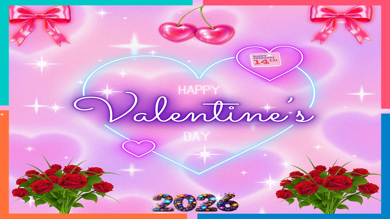 This Happy Valentine's Day 2026 wallpaper blends soft pink, vibrant red, neon purple, and pastel blue tones to create an inviting and romantic ambiance. Its high-definition backgrounds and premium design make it an excellent choice for anyone looking to infuse their digital space with love and celebration during this special holiday.