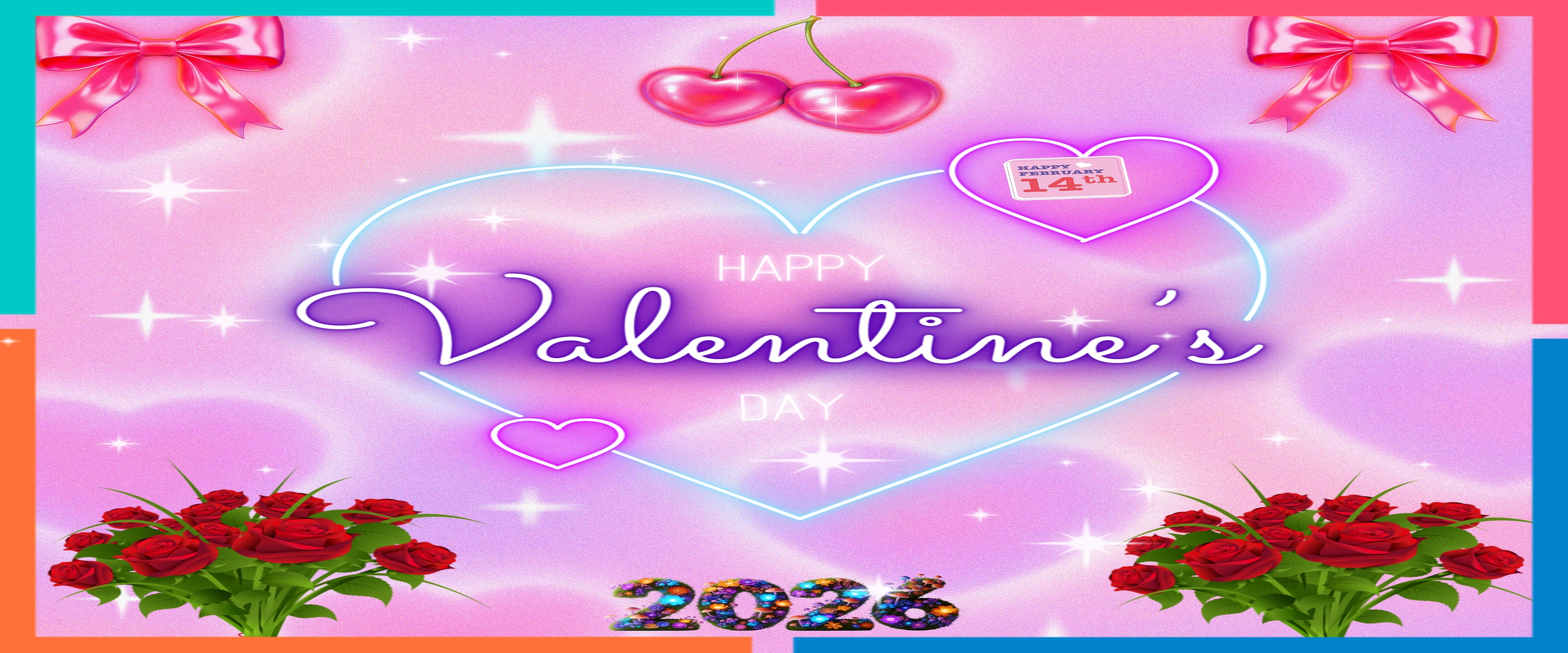 Celebrate love and affection with this enchanting Happy Valentine's Day 2026 wallpaper, featuring a dreamy pastel pink background adorned with soft heart shapes and sparkling star effects. The main subject is a glowing neon heart outline in pastel blue and purple hues, framing the elegant script text "Valentine's" in vibrant neon purple, creating a warm and inviting atmosphere perfect for the season of romance. Two shiny red cherries hang playfully above the heart, adding a whimsical touch, while two bright red rose bouquets at the bottom corners enhance the romantic theme with natural beauty and rich color.